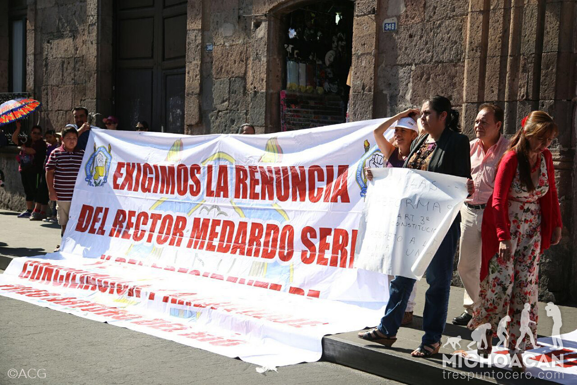 Morelia, Michoacán.-Integrantes del Sindicato Único de Empleados de la Universidad Michoacana (SUEUM) se manifestaron frente al Colegio Primitivo de San Nicolás de Hidalgo, luego de que la semana pasada se rompieran las mesas de negociaciones que se realizaban entre los trabajadores y las autoridades universitarias en torno a las violaciones del Contrato Colectivo de Trabajo (CCT).