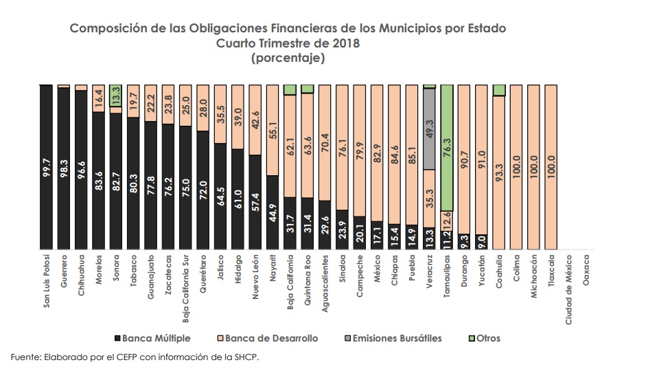 Explica que dicho incremento implica una tasa de crecimiento media anual de 3.4 por ciento en términos reales, y refiere que el saldo de las obligaciones financieras de los municipios por tipo de acreedor a diciembre de 2018 se distribuye de la siguiente manera: 22 mil 863.4 millones de pesos (47.2%) provienen de la banca múltiple; 21 mil 981 millones (45.4%) de la banca de desarrollo; mil 417.5 millones (2.9%) de emisiones bursátiles y dos mil 142.6 millones (4.4%) se originan en otros conceptos como los fideicomisos.