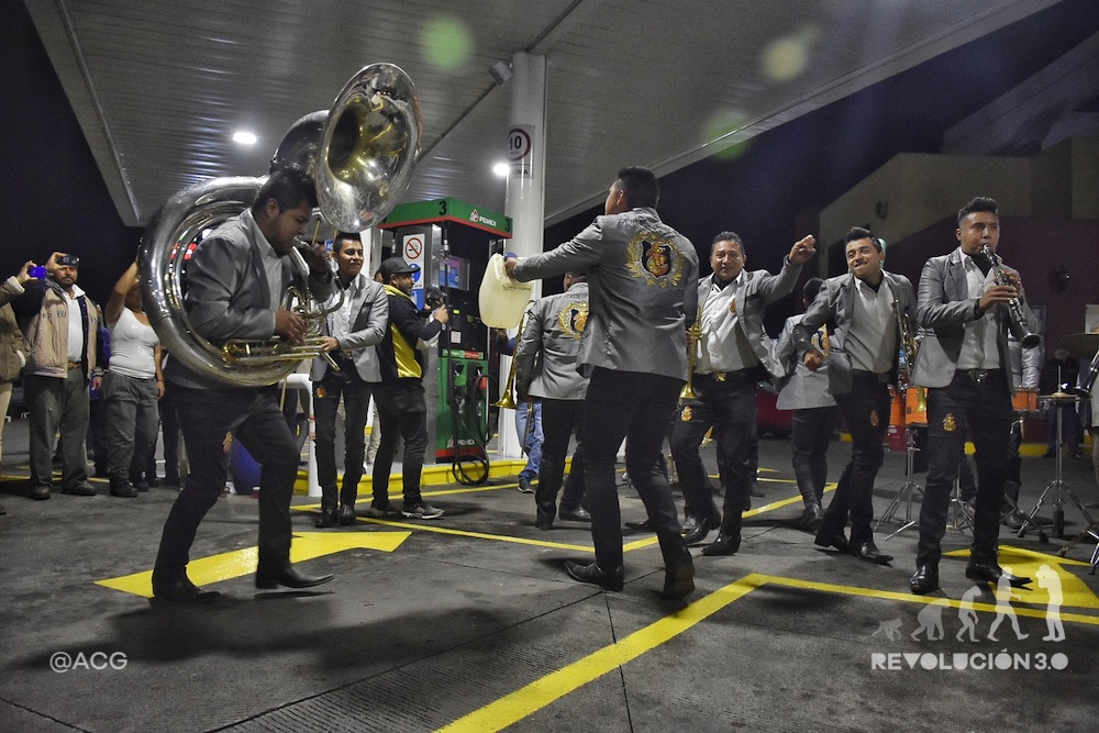 Morelia, Michoacán.- La Banda Cruz de la Candelaria, la Herencia del Rey, agrupación que la madrugada de este miércoles amenizó a los automovilistas y usuarios que pasaban la noche en espera de gasolina en una estación de servicio de Morelia, sólo había salido a buscar cena, cuando de manera espontánea, terminaron entre la multitud en una presentación musical improvisada.
