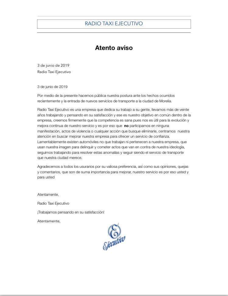 A través de un comunicado de prensa, la línea de taxis con más de 20 años de servicio declaró que ninguno de sus taxistas participa en las movilizaciones en contra de Uber o Cabify.