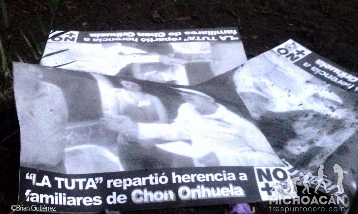 “Narco, transa, violador, prepotente y bastante pendejo”, “La Tuta repartió herencia a la famialia de Chon Orihuela, No + PRI”, dicen los panfletos que ilustran con la imagen de Orihuela Estefan (al medio), Rodrigo Vallejo Mora y Chon Orihuela (a los lados).