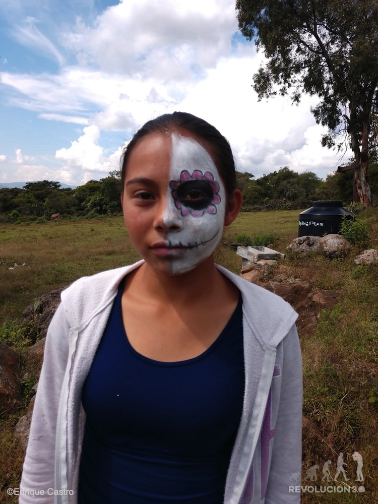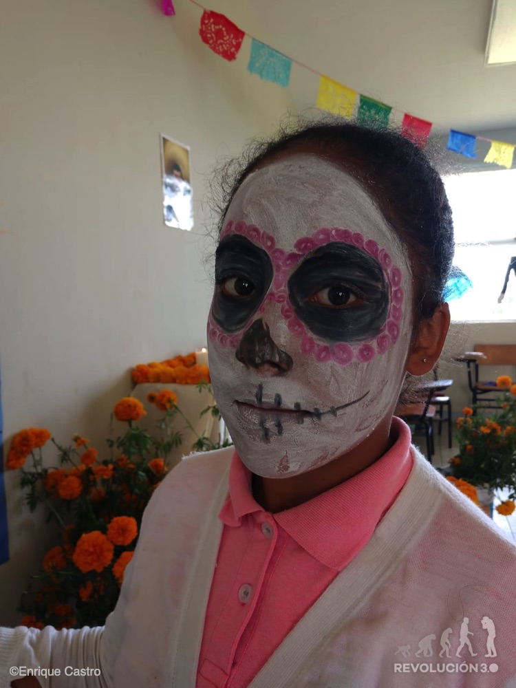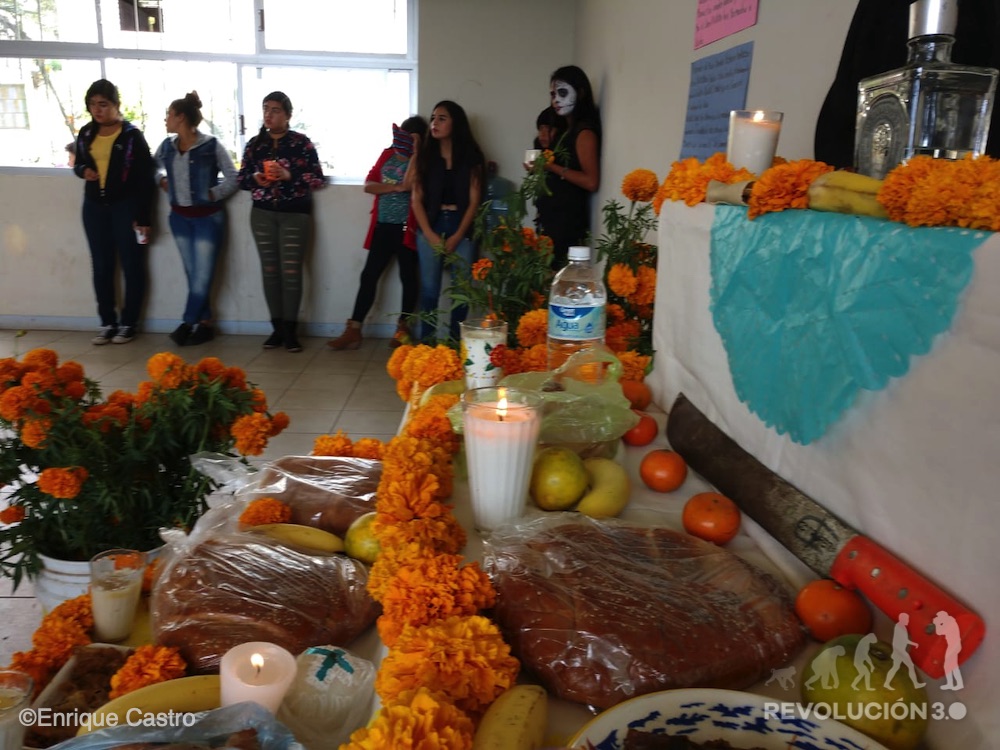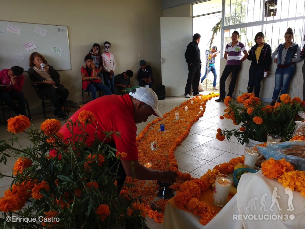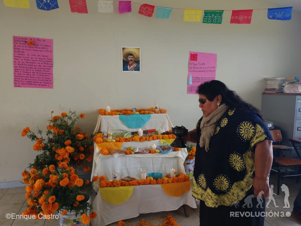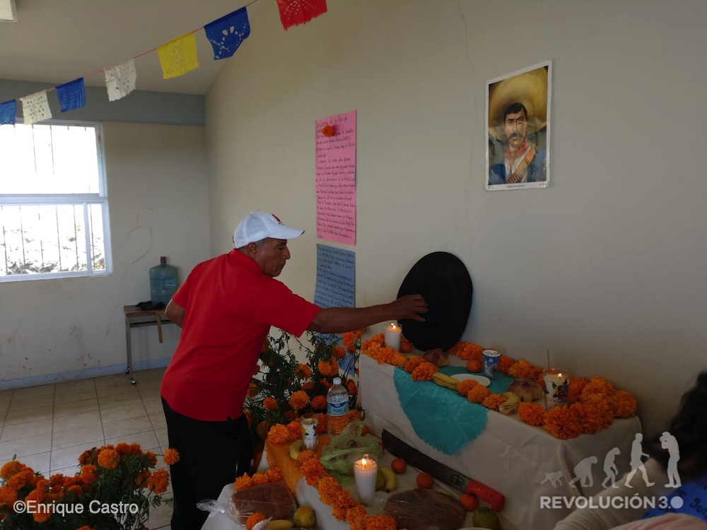 Los estudiantes decoraron una ofrenda dedicada a “Mi general Zapata” según la maestra que colocaba el copal en dicho lugar. Un machete, tequila, un retrato del caudillo revolucionario y un sombrero remataba el camino de Cempasuchil que comenzaba en la puerta del único salón de cemento que tiene la Telesecundaria.