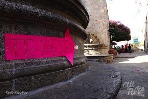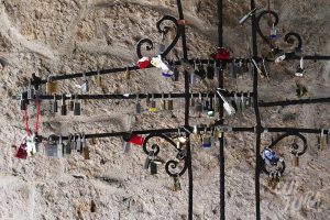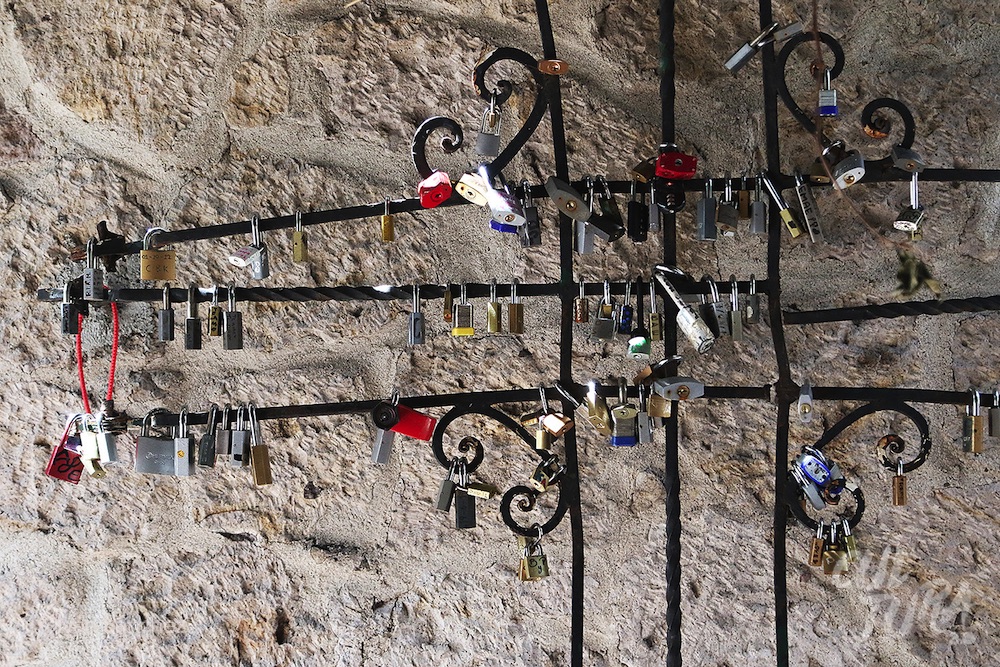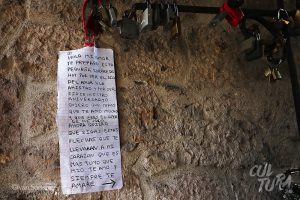 Casi al final de la estrecha calle se encuentra una manta en la que se lee un Te Amo Evelin, ahí la pareja, a un lado de la fuente, se reitera su amor a perpetuidad con su candado de “amarre”.