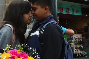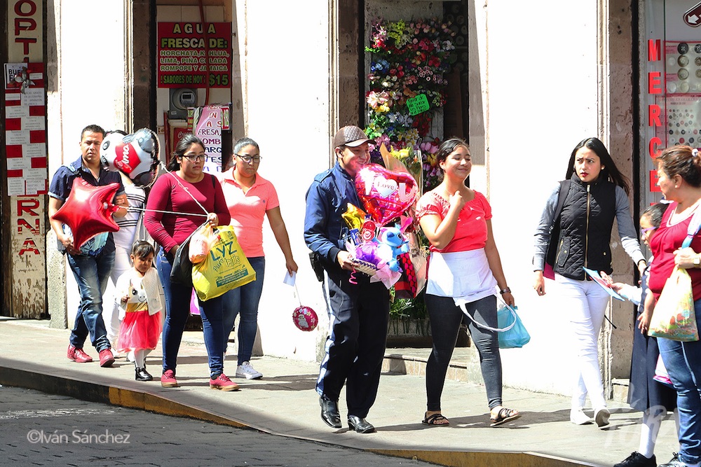 Por la avenida principal de la ciudad, con dirección al poniente, cruzo con personas y parejas que llevan sus obsequios, tal vez apenas a entregar o ya los recibieron. Globos y flores es lo que mayormente llevan.