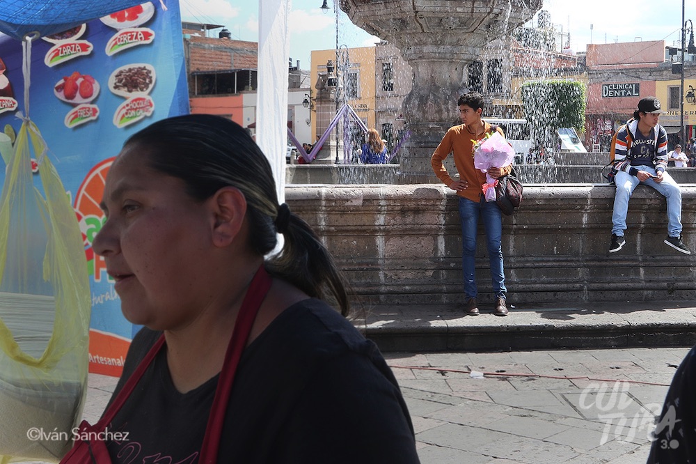 Prosigo mi caminata, todo es comercio justificado por el santoral del día; flores, adornos de mesa, ofertas de ropa y zapatos, arcos de amor, más flores… Llego a la Plaza de Armas y me ubico en una banca al sur poniente, pareciera que la miel brota de alguna de las fuentes que la adornan.