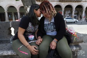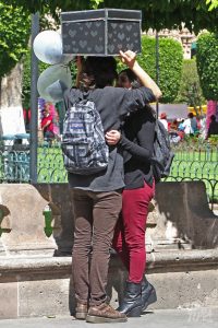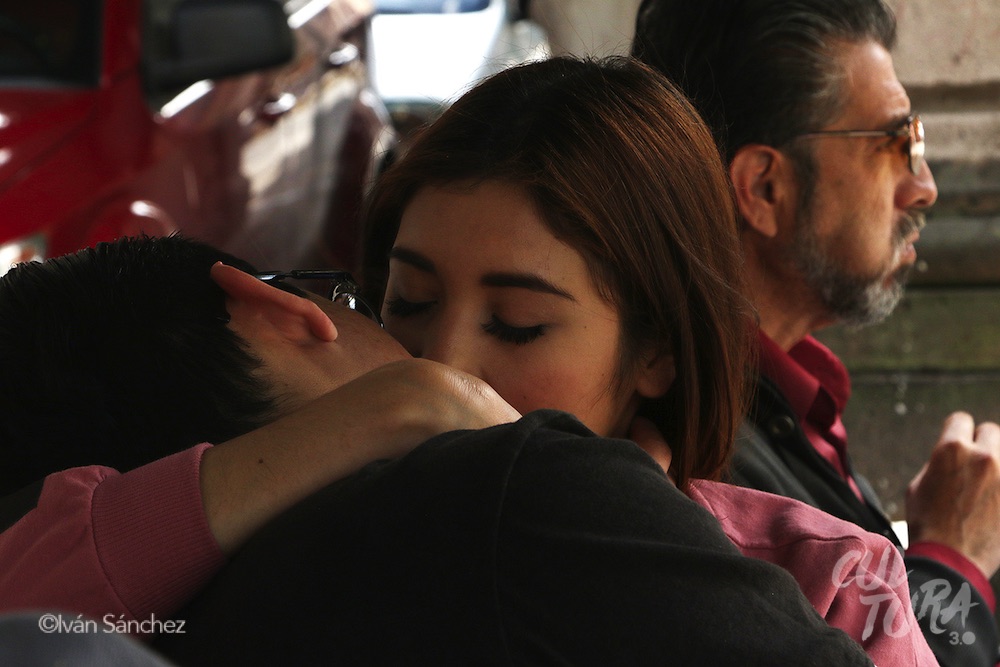 El muchacho llama a alguien, pero parece que sin éxito. Enseguida llegan dos jovencitas, una viste uniforme escolar y otra ropa ordinaria; la primera lleva una caja de regalo, mientras la otra lleva un globo. Por un momento pienso que la joven sin uniforme es a la que espera el muchacho para entregarle el obsequio, me apresuro a tomar la foto.