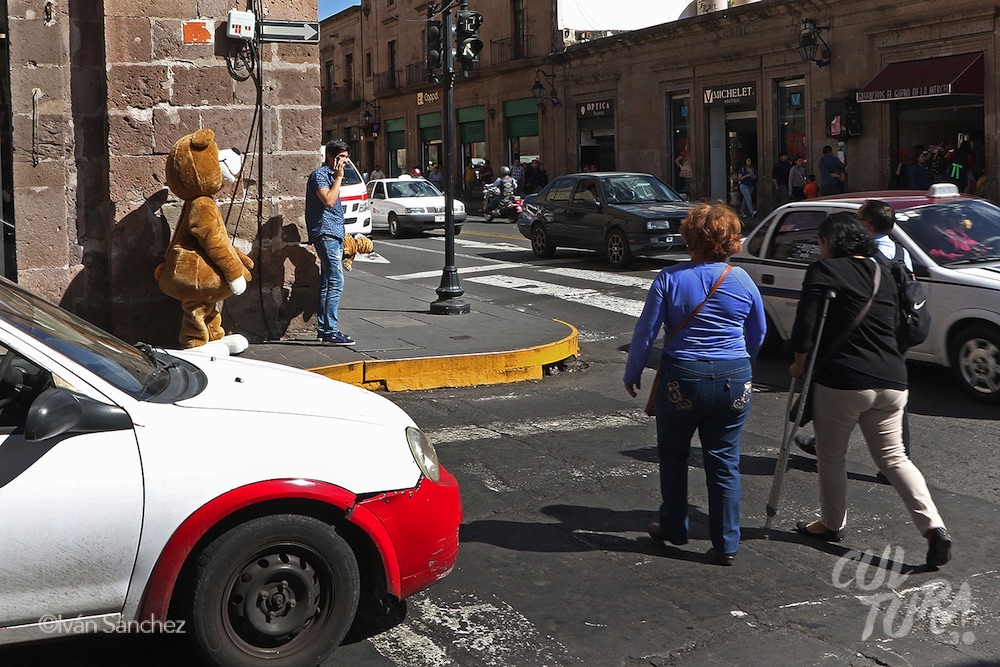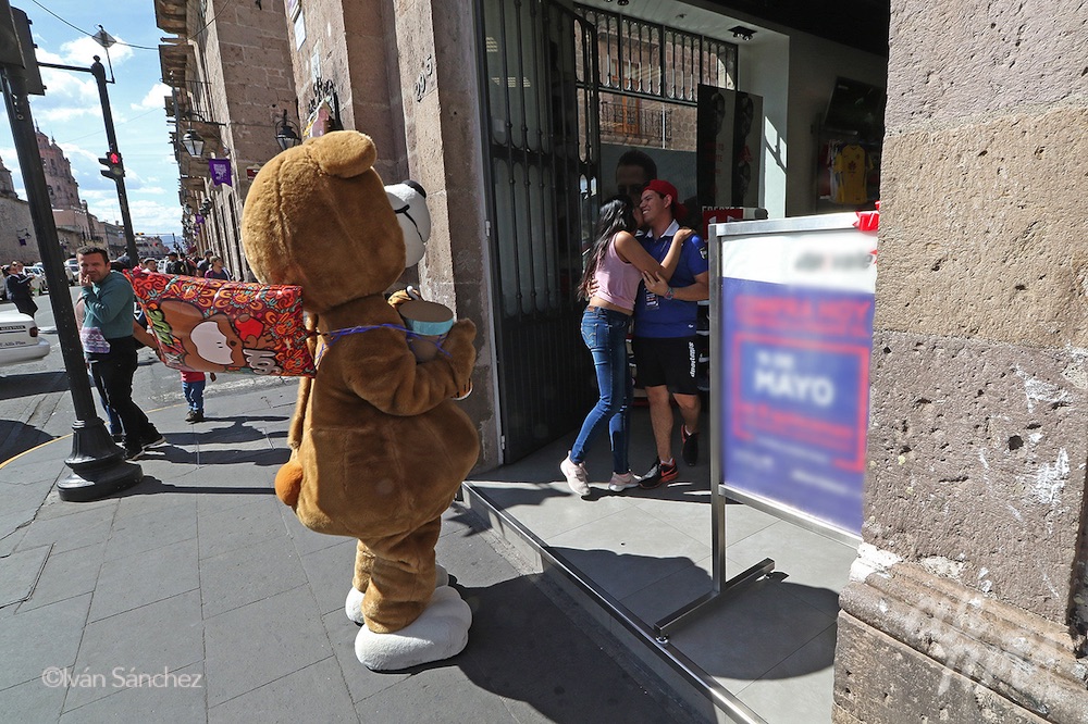 A mi regreso, al llegar a una esquina observo a un joven con un tigre de felpa en mano y con celular en la otra, se ve ansioso, a su lado hay una botarga de oso de peluche que saluda y envía besos a los transeúntes.