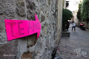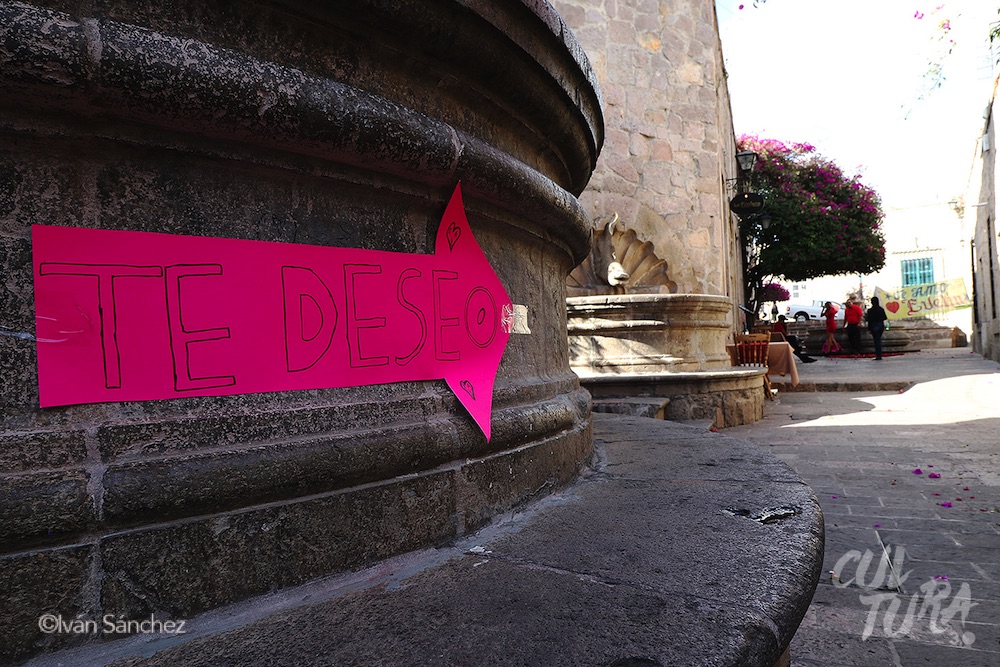 Finalmente, después de comer, caminamos por el Callejón del Romance, una carta de amor pegada a la pared junto con unas flechas hechas de cartulina rosa fosforescente llaman mi atención; son cuatro flechas de tamaño considerable con una leyenda en cada una: te quiero, te amo, te extraño y te deseo.