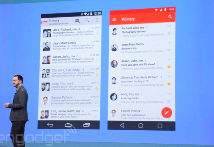 Como ya se había anunciado, Google mostró un poco de su nueva interfaz para Android, que ahora luce mucho más limpia y plana. La base de esta nueva imagen es lo que llaman “Material Design”, que consiste en darle más profundidad a la interfaz, dando la opción a los desarrolladores de elegir la altura que tendrá cada elemento.