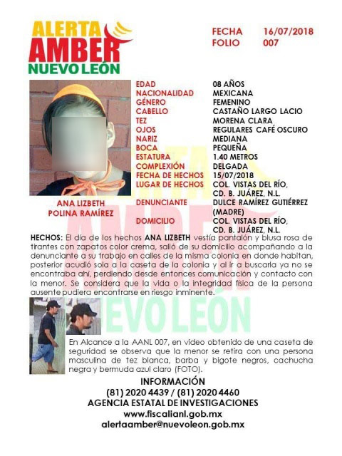 A dos días de su desaparición, la pequeña Ana Lizbeth Ramírez  fue localizada muerta en un terreno baldío en el municipio de Juárez, Nuevo León. La menor de edad había sido raptada cuando acompañó a su madre al trabajo el día domingo.