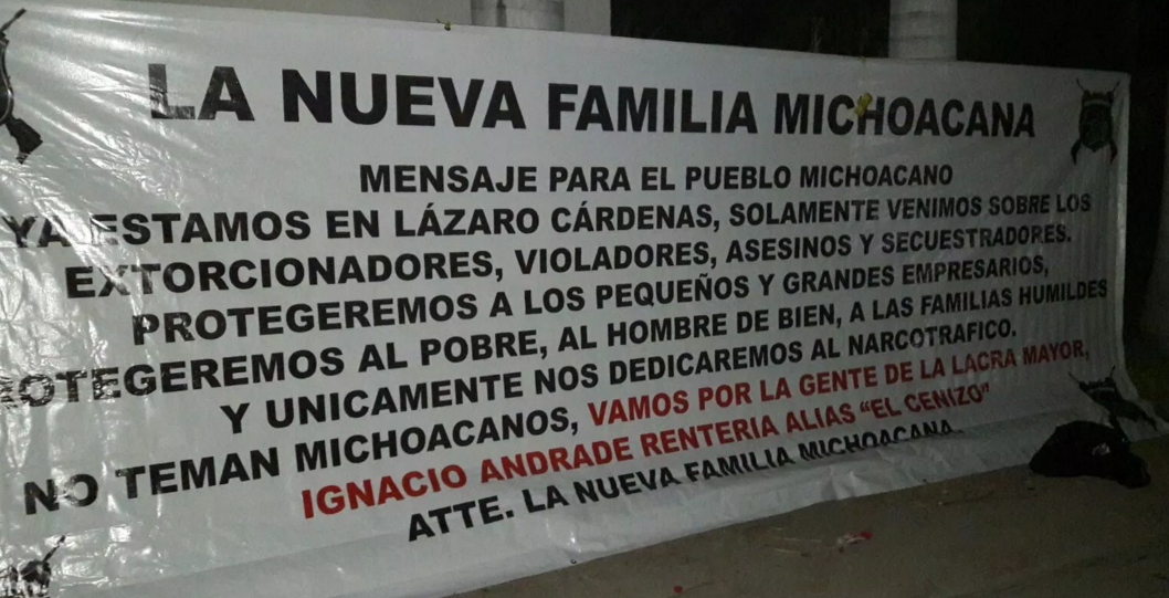 “La Nueva Familia Michoacana mensaje para el pueblo michoacano ya estamos en Lázaro Cárdenas, solamente venimos sobre extorsionadores, violadores, asesinos, y secuestradores, protegeremos a los pequeños y grandes empresarios, protegemos al pobre, al hombre de bien, a las familias humildes y únicamente nos dedicamos al narcotráfico, no teman michoacanos, vamos por gente de la lacra mayor, Ignacio Andrade Rentería alias ‘El Cenizo’. Atte. La Nueva Familia Michoacana”, rezaba una de las lonas.