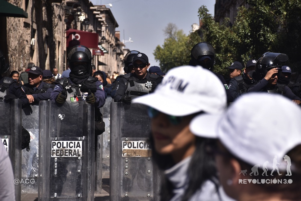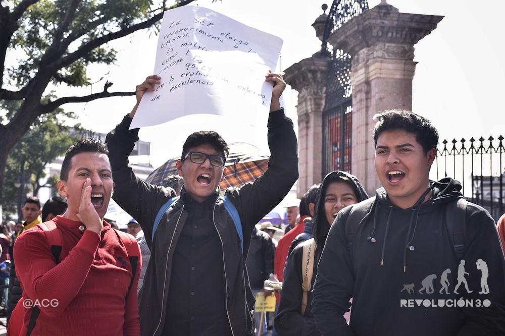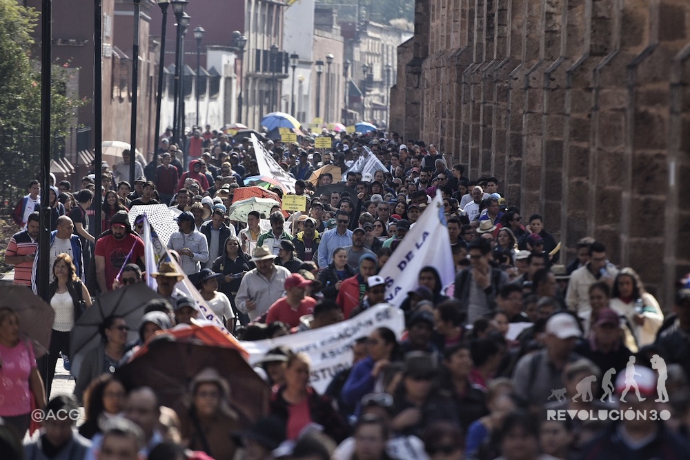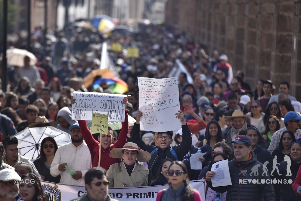 “Ni la Rectoría, no nos moverán…”, inician a corear algunos docentes de la Universidad Michoacana; “Ni Silvano Aureoles, no nos moverán”, le secundan los trabajadores de la Universidad Indígena Intercultural del Estado.