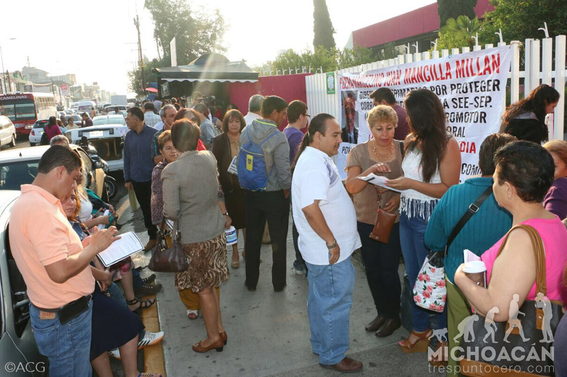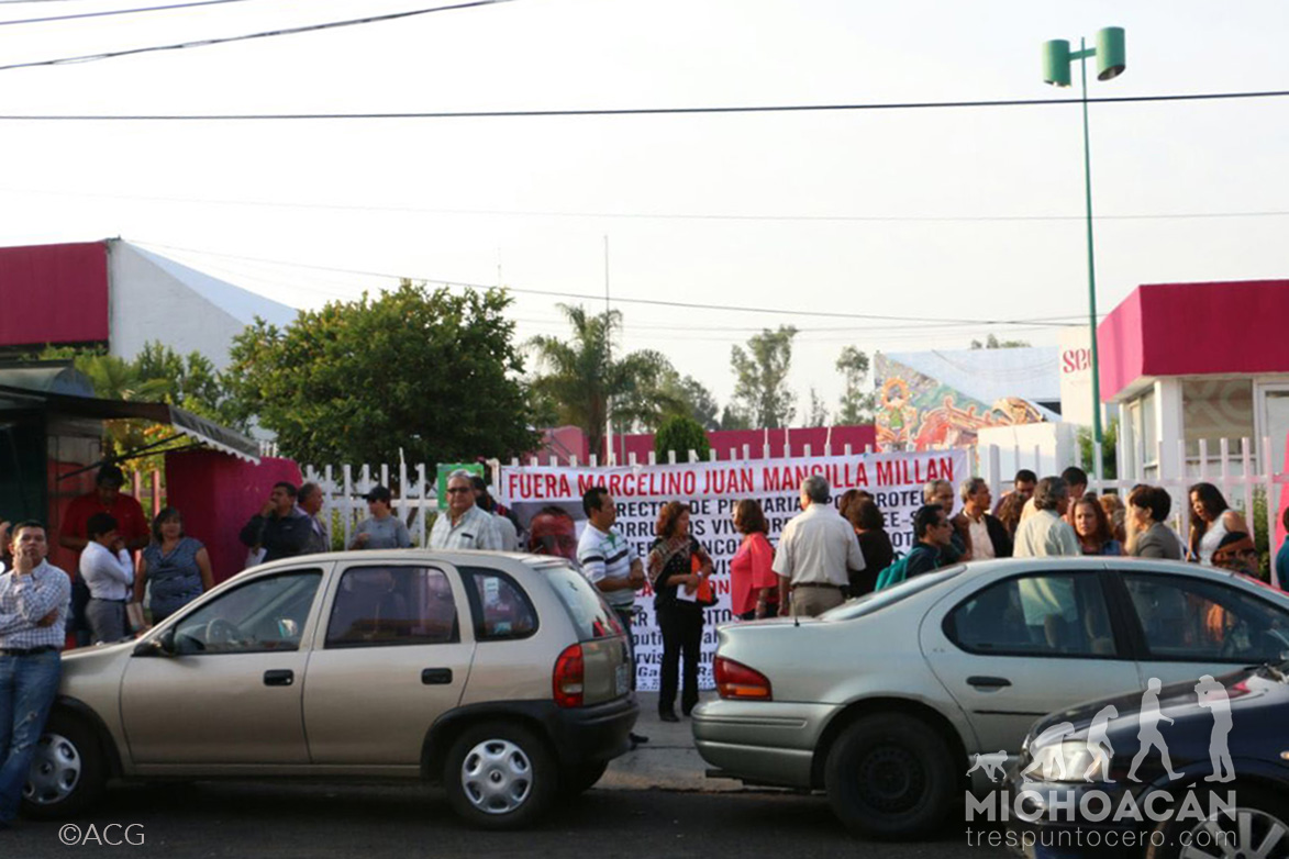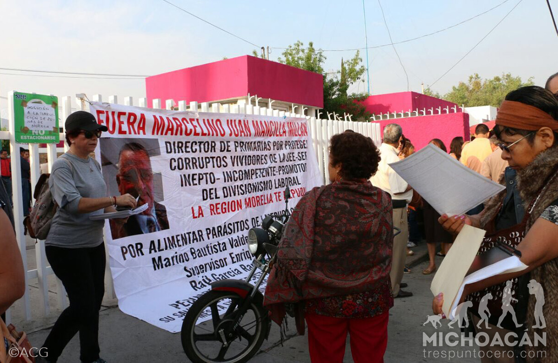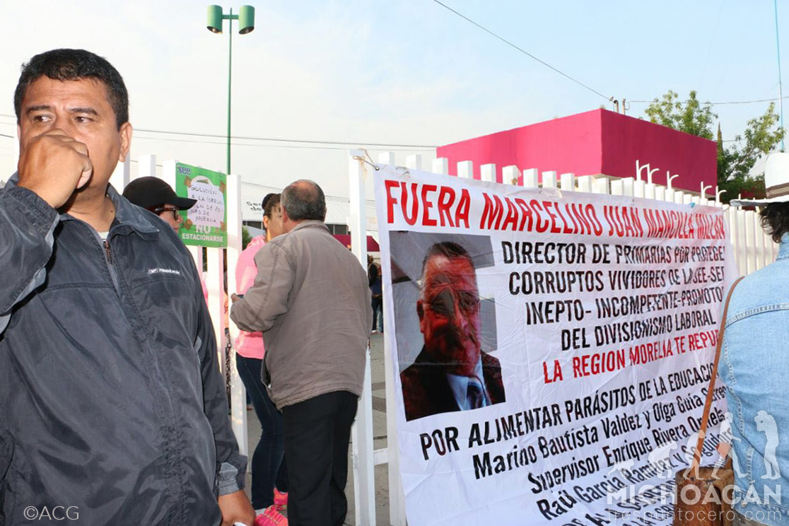 A las afueras dependencia colgaron una manta en contra del director: “¡Fuera por proteger corruptos vividores de la SEE y la SEP; inepto, incompetente, promotor del divisionismo laboral, la región Morelia te repudia!”.