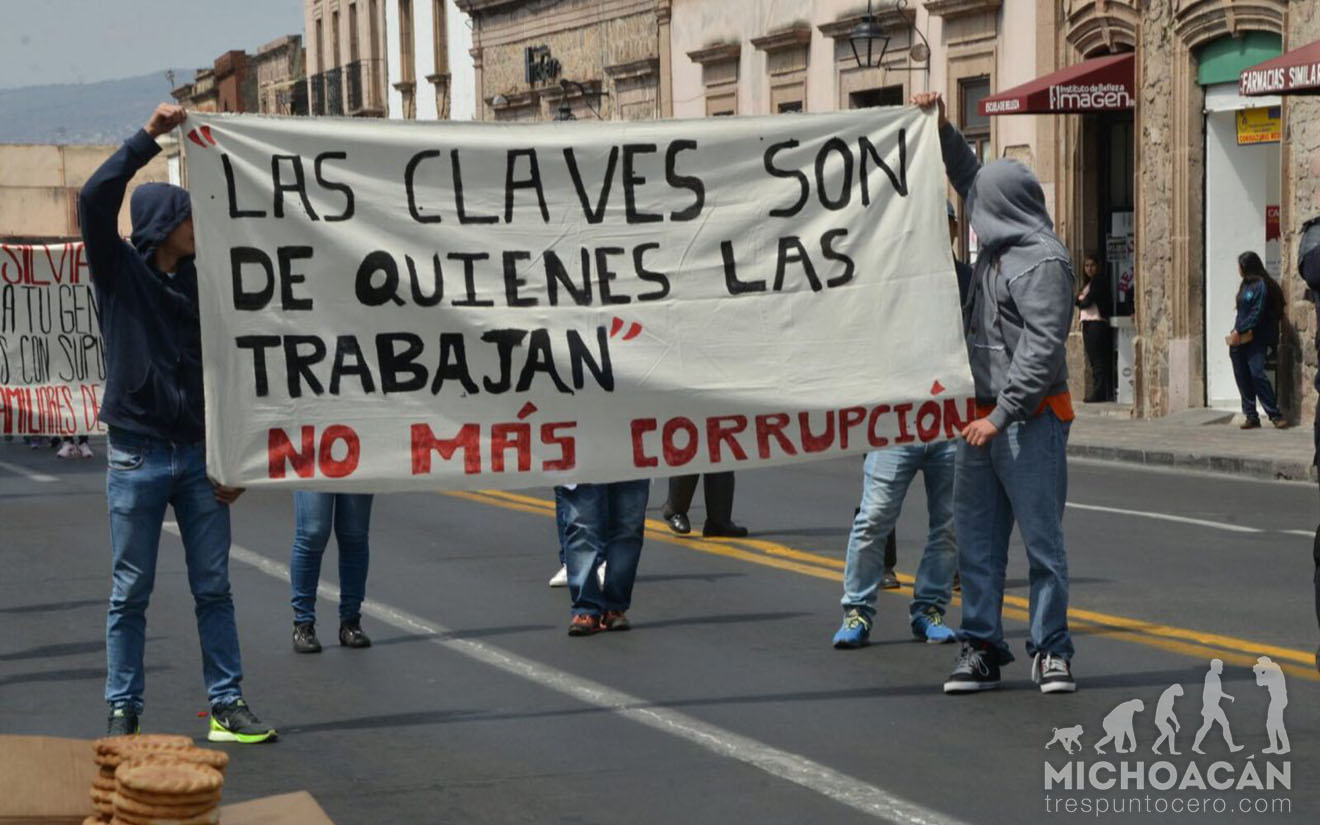 Bajo la consigna: “No hay duplicidad hay complicidad, solución ya”, “Las claves son de quienes las trabajan. No más corrupción”, los profesores recorrieron la Avenida Madero para llegar frente al Palacio de Gobierno donde realizan un mitin para dar a conocer su problemática.