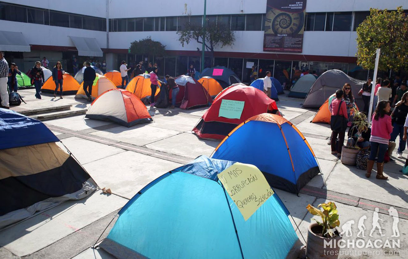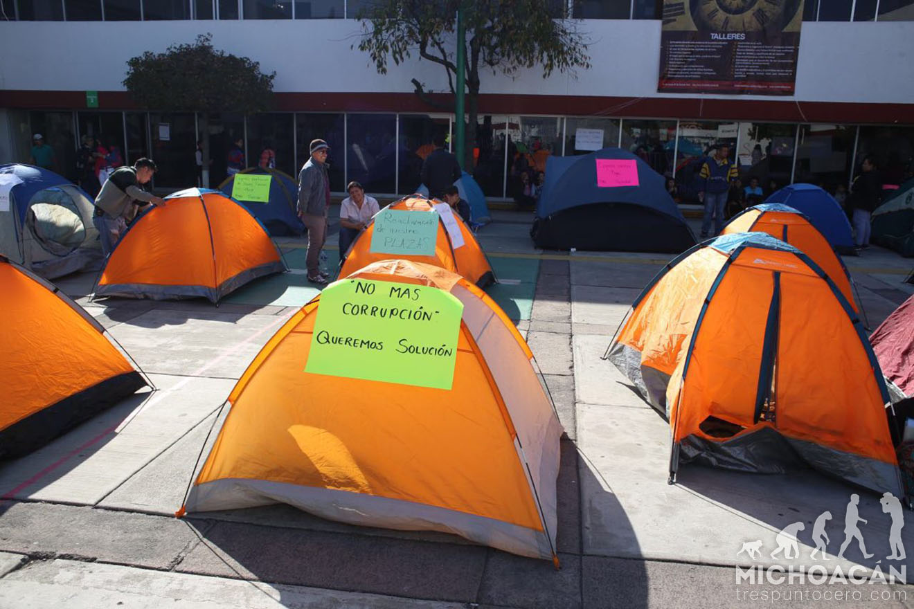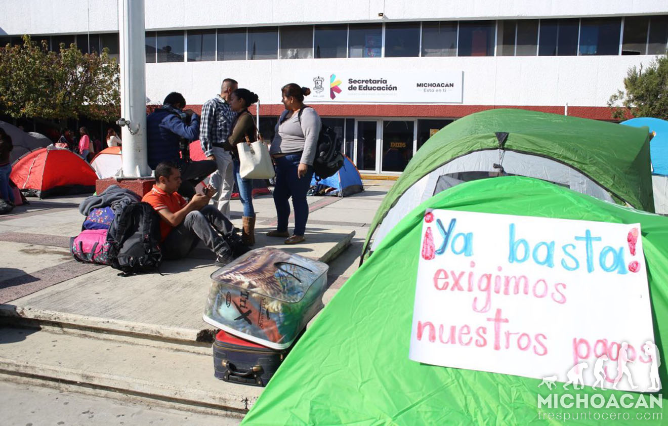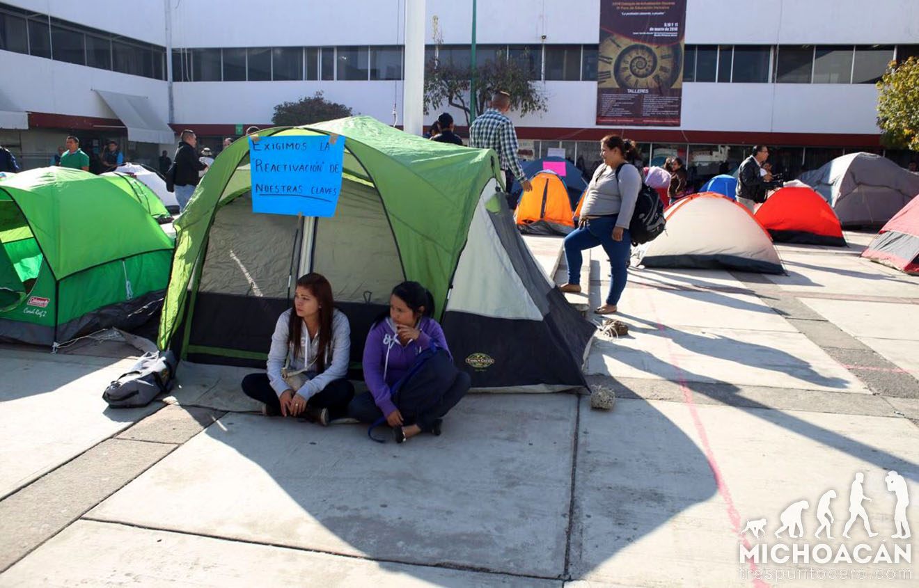 Morelia, Michoacán.-Profesores volvieron a instalar un plantón en la Secretaría de Educación en el Estado (SEE) para exigir solución a sus demandas, luego de que llevan seis meses sin cobrar debido a que sus claves fueron suspendidas por supuestamente estar duplicadas.