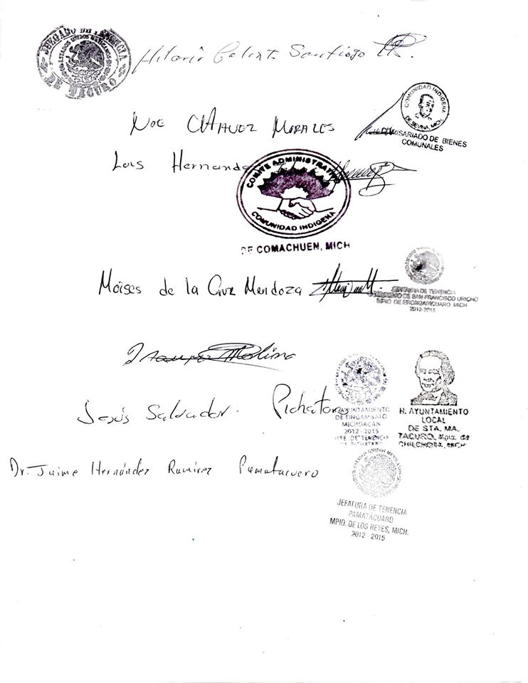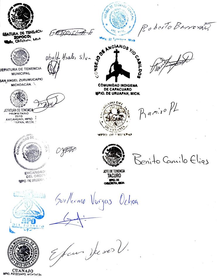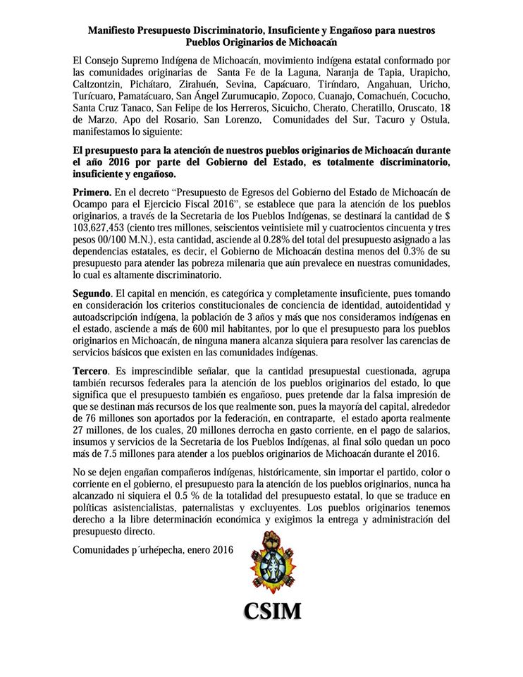El Consejo Supremo Indígena de Michoacán, movimiento indígena estatal conformado por las comunidades originarias de Santa Fe de la Laguna, Naranja de Tapia, Urapicho, Caltzontzin, Pichátaro, Zirahuén, Sevina, Capácuaro, Tiríndaro, Angahuan, Uricho, Turícuaro, Pamatácuaro, San Ángel Zurumucapio, Zopoco, Cuanajo, Comachuén, Cocucho, Santa Cruz Tanaco, San Felipe de los Herreros, Sicuicho, Cherato, Cheratillo, Oruscato, 18 de Marzo, Apo del Rosario, San Lorenzo, Comunidades del Sur, Tacuro y Ostula, manifestamos lo siguiente: