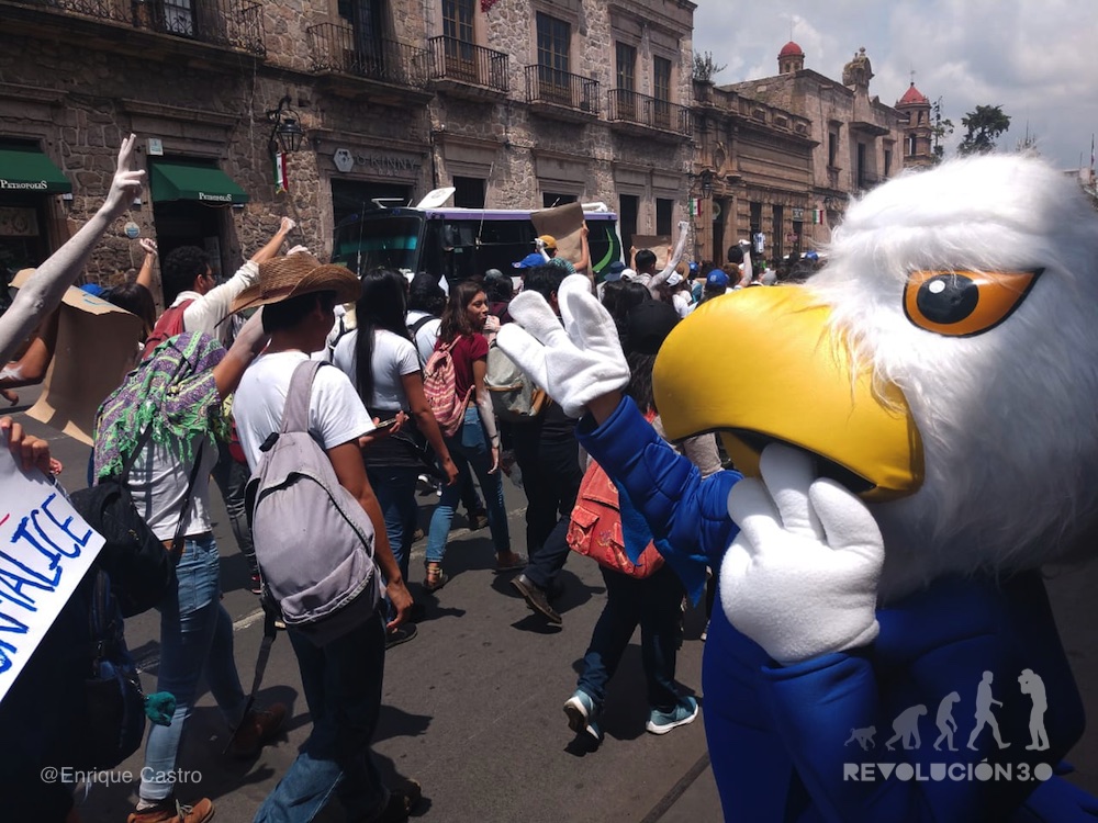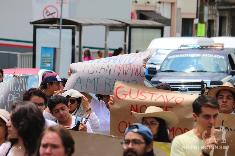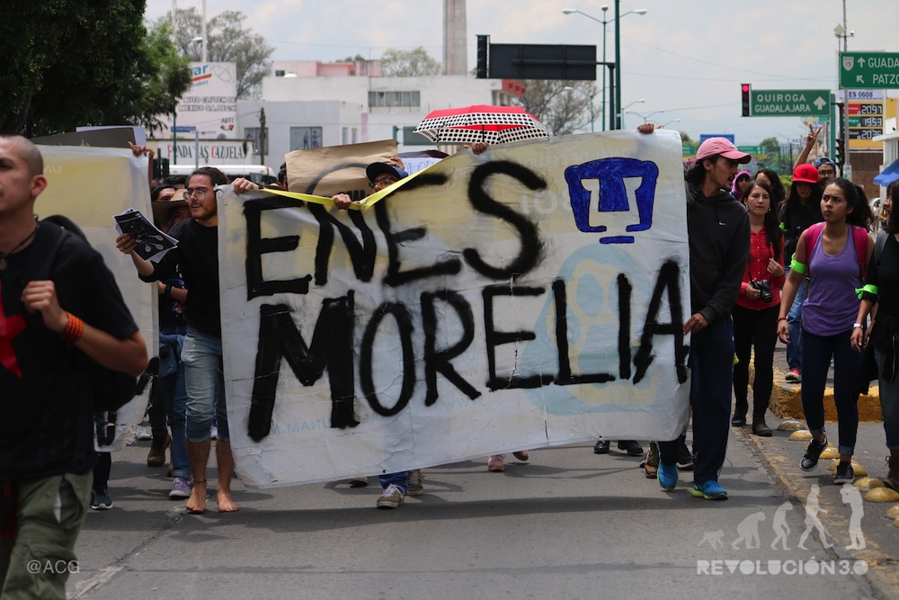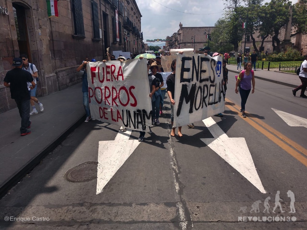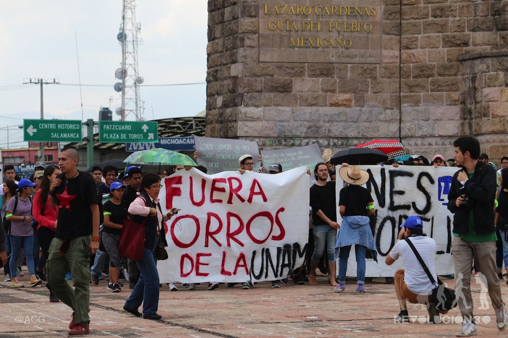 Con mantas y consignas que condenaron la agresión de porros en contra de 200 jóvenes en el Colegio de Ciencias y Humanidades Azcapotzalco, los universitarios de Morelia señalaron debilidad de las autoridades de la UNAM ante los hechos, al igual que recordaron a los 43 normalistas de Ayotzinapa.