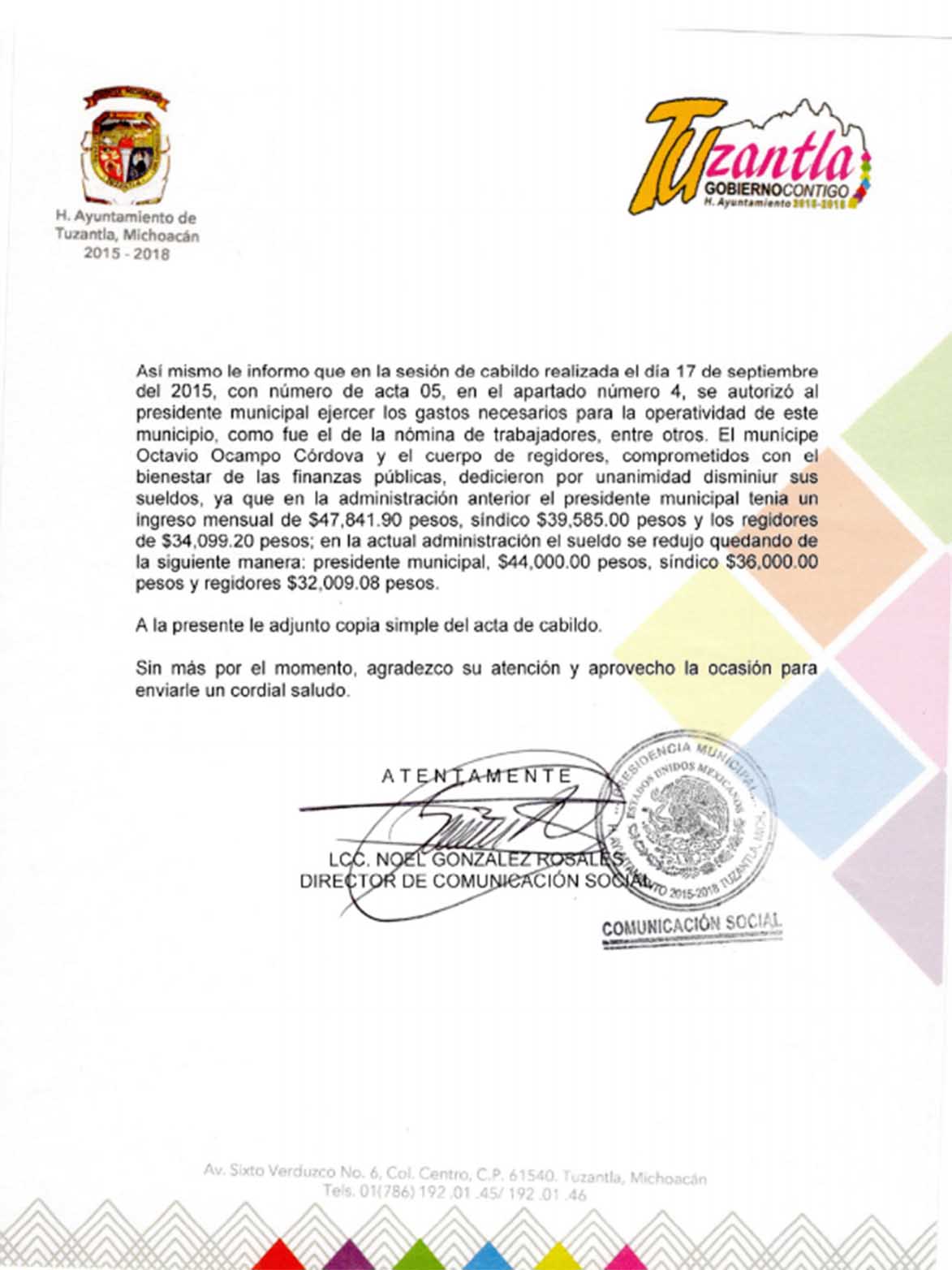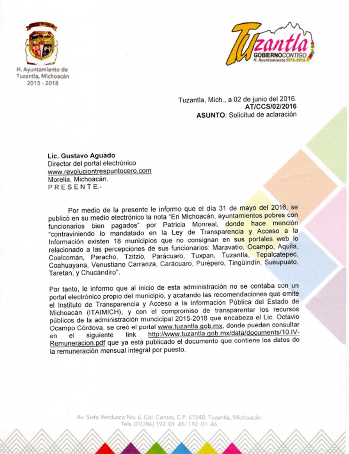 Este jueves fue turnada a Michoacán TresPuntoCero una solicitud de aclaración al reportaje “En Michoacán, ayuntamientos pobres con funcionarios bien pagados”, signada por Noel González Rosales, director de comunicación social del Ayuntamiento de Tuzantla.