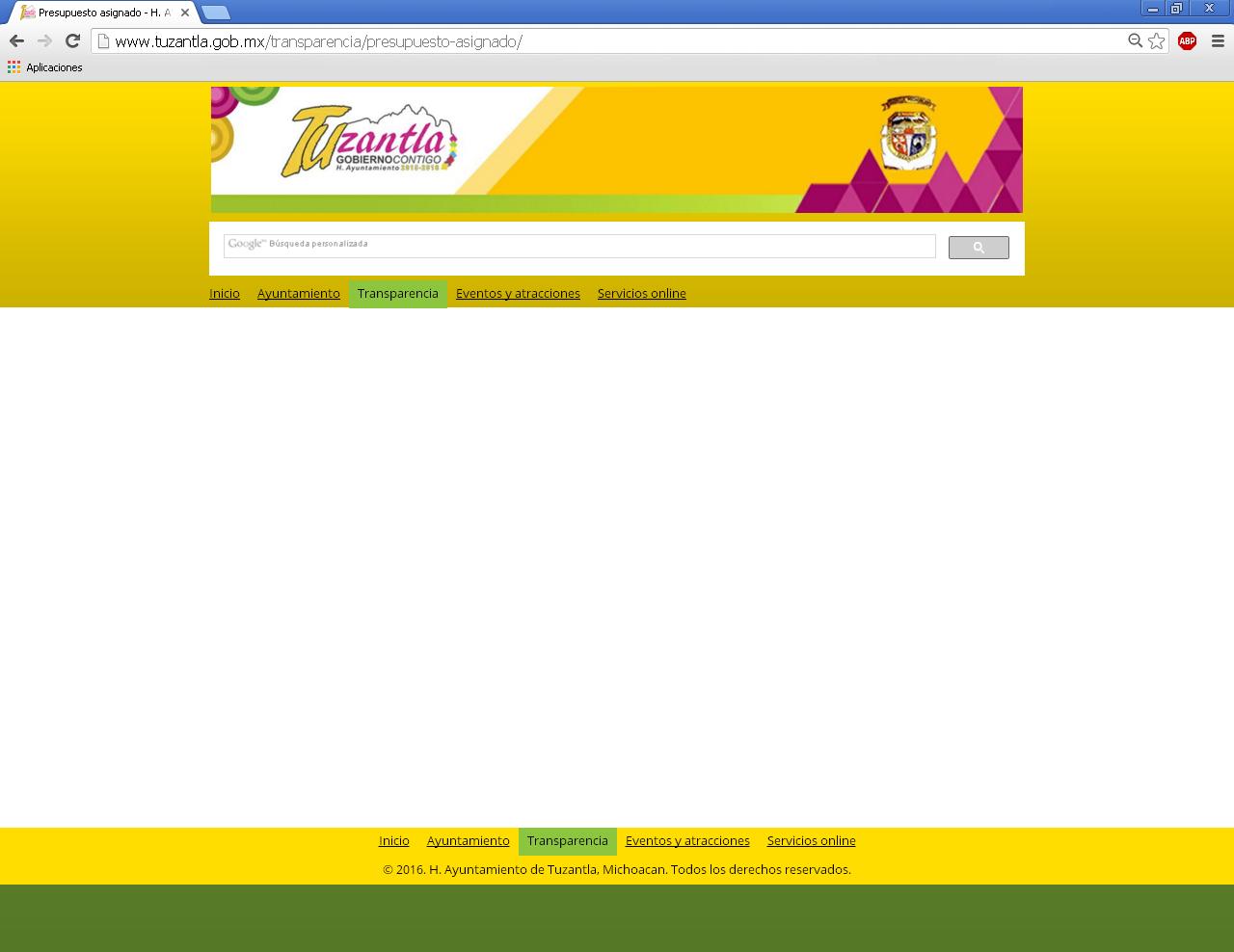 Tal información generalmente se puede consignar en el Periódico Oficial del Estado en donde se publica el presupuesto de egresos de cada Ayuntamiento, sin embargo, en el portal web de Tuzantla, contraviniendo a lo que establece la Ley de Transparencia y Acceso a la Información Pública, en el apartado de transparencia, en lo que concierte a la información de oficio que mandata la fracción VIII de la referida norma, hasta este jueves 2 de junio no aparecía información alguna sobre el presupuesto asignado, así como tampoco los informes sobre su ejecución (http://www.tuzantla.gob.mx/transparencia/presupuesto-asignado).