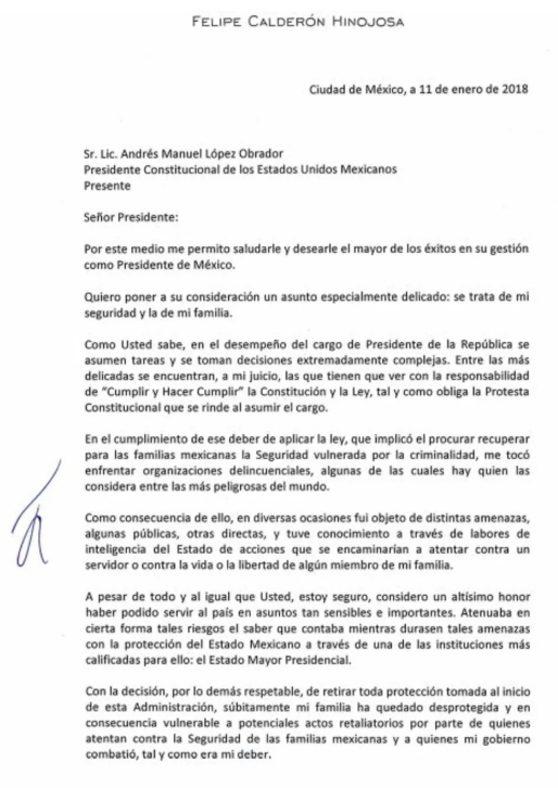 El expresidente Felipe Calderón Hinojosa envío una carta al presidente Andrés Manuel López Obrador, para señalarle que no tiene dinero suficiente para costear su seguridad y la de su familia.