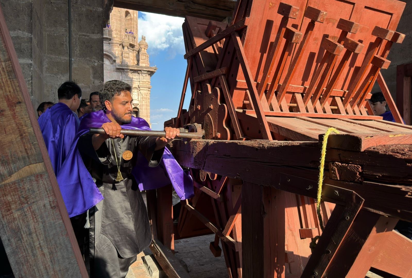 El titular de Sectur enfatizó que la matraca monumental fue instalada en 1856 y destaca por su compleja estructura, ya que cuenta con seis cajas de resonancia, dos manivelas con forma de estrella y nueve mazos, elementos que en conjunto generan su característico sonido que anuncia solemnidad y recogimiento.