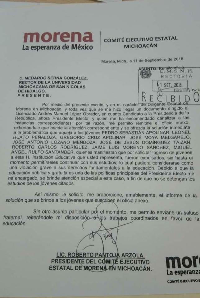 El dirigente de Morena en Michoacán, Roberto Pantoja Arzola hizo la petición al rector de la Universidad Michoacana, Medardo Serna González, para que le permita a jóvenes expulsados que participaron hace un año con el Movimiento de Aspirantes y Rechazados (MAR) continuar con sus estudios en la Casa de Hidalgo, a lo que el rector Medardo Serna González respondió que “es una petición más de las miles que llegan a Rectoría”.