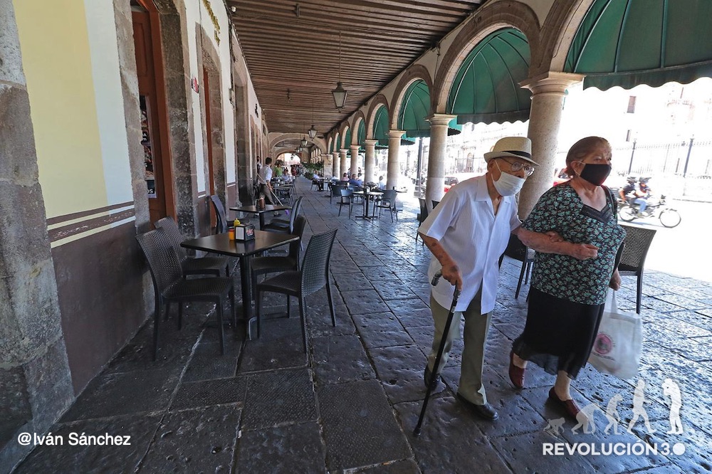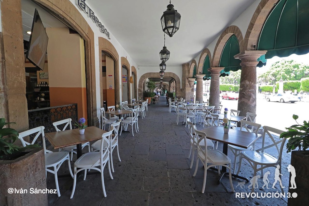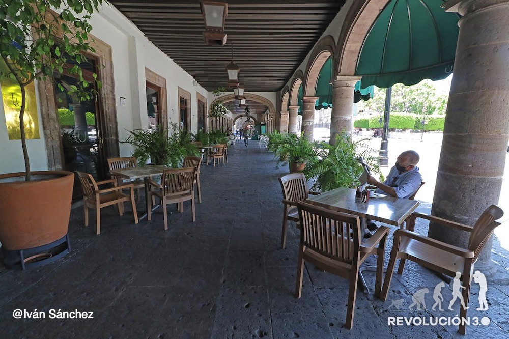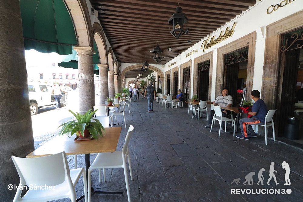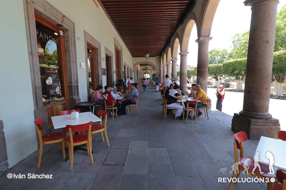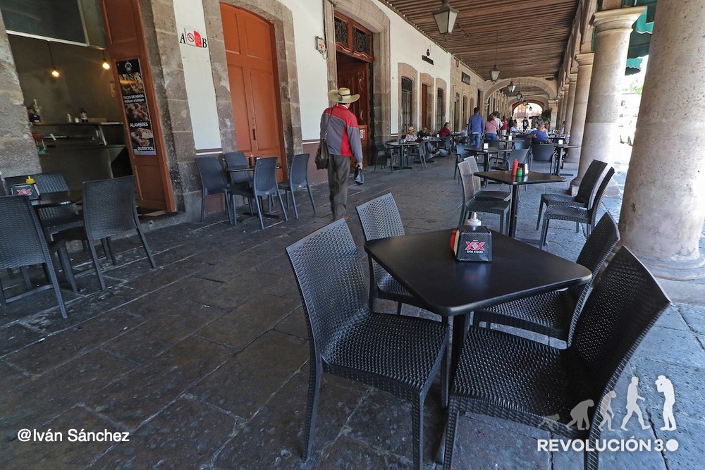 Morelia, Michoacán.- A pesar del llamado por parte del Ayuntamiento de Morelia para mantener el distanciamiento social en espacios públicos de la capital del estado, cafeterías ubicadas en los portales del centro histórico reabrieron sus locales para retomar el servicio al público.