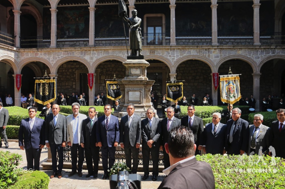 Casi una hora fue el espacio usado por el funcionario en la tribuna conmemorativa del nacimiento del Libertador, instalada como ya es una costumbre en el segundo patio del Primitivo y Nacional Colegio de San Nicolás, evento en el que a diferencia de otros años, asistió el gobernador Silvano Aureoles Conejo, lo que convirtió al histórico plantel en un espacio severamente controlado por los elementos de seguridad del mandatario, quien mientras hablaba Concheiro ocupaba el tiempo en saludar, sobarse constantemente las manos y hacer guiños hacia quienes tenía enfrente y dándole la espalda a las mantas de los manifestantes en el lugar.