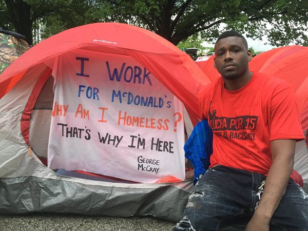 Los manifestantes han montado decenas de tiendas de campaña y un escenario improvisado en el que pronuncian discursos en apoyo del movimiento por un salario digno y “comparten talentos”, según un tuit de la organización. Sus pancartas rezan: “Trabajo para McDonald’s. ¿Por qué no tengo un techo?” o “‘I’m NOT Lovin’ It’ porque McDonald’s no me paga lo debido”, en alusión al lema de la compañía, ‘I’m Lovin’ It’ (me gusta).