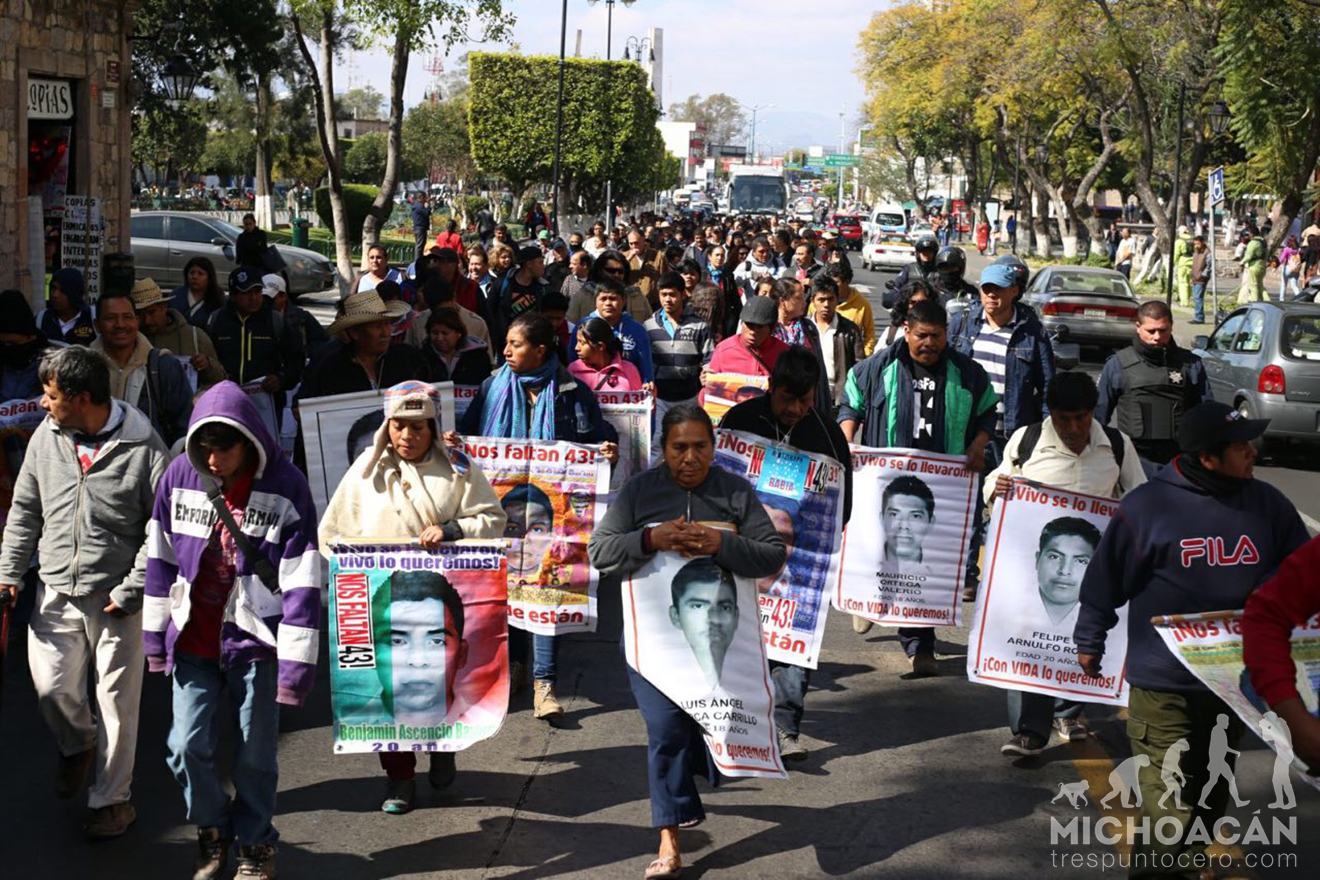 Acompañados de miembros de la Coordinadora Nacional de Trabajadores de la Educación (CNTE), organizaciones sociales, y normalistas, recorrieron las calles de Morelia de la salida a Pátzcuaro hasta el Centro Histórico, en demanda de justicia, pues a 16 meses no hay respuestas claras y concretas sobre el paradero de los estudiantes.