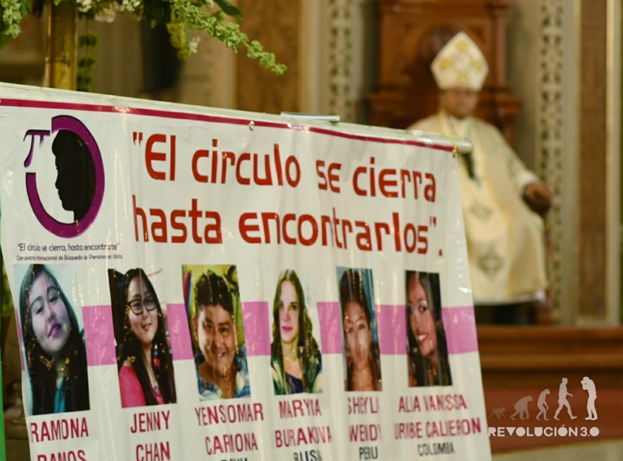 A los pies del altar de catedral, el tendido de imágenes, cartelones y fotografías de aquellos que son buscados por su familiares estado por estado, país por país.