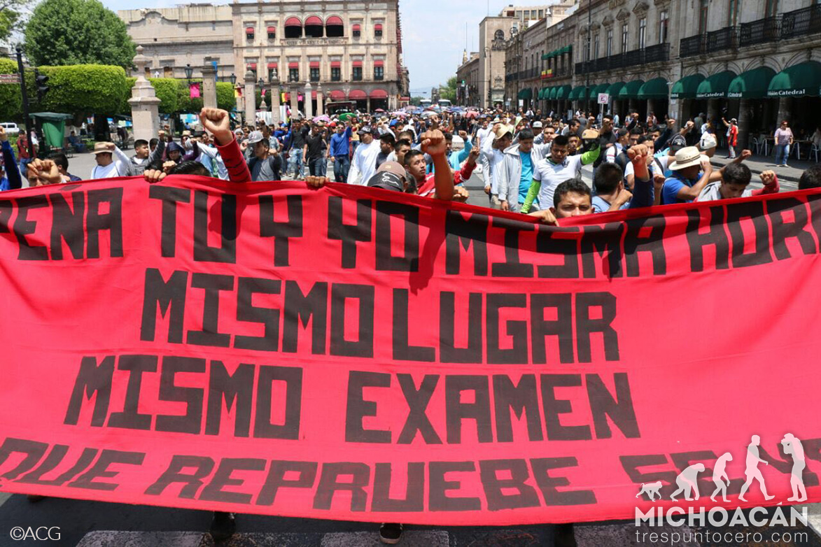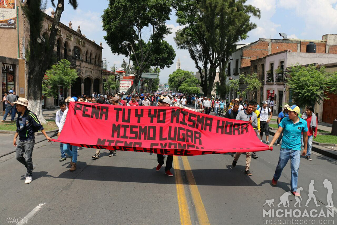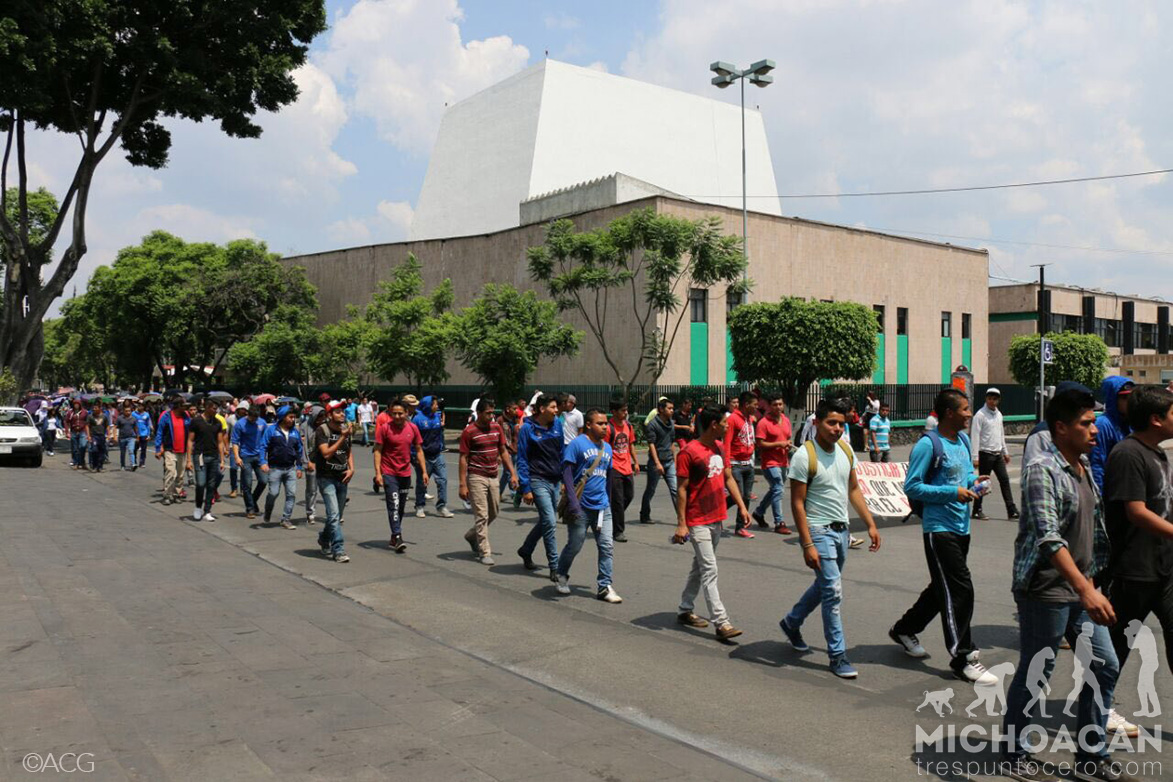 Morelia, Michoacán.-Con el propósito de exigir el pago de becas que les adeudan en lo que va de este año, entre otras demandas, estudiantes normalistas realizaron una marcha de la salida a Pátzcuaro al Centro Histórico de Morelia.