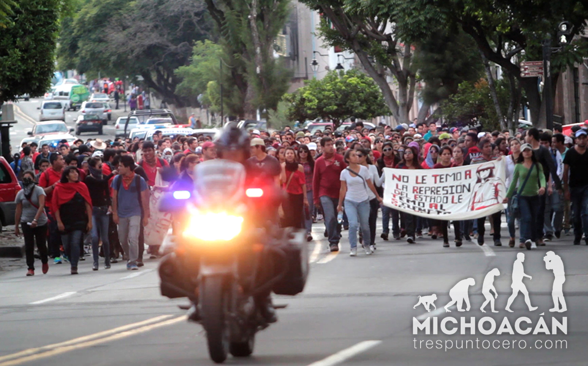 Al grito de “ni la lluvia ni el viento detendrán el movimiento” las decenas de estudiantes se dirigen hacia el primer cuadro de la capital como parte de sus jornadas de protesta contra la postura del gobernador Silvano Aureoles Conejo.