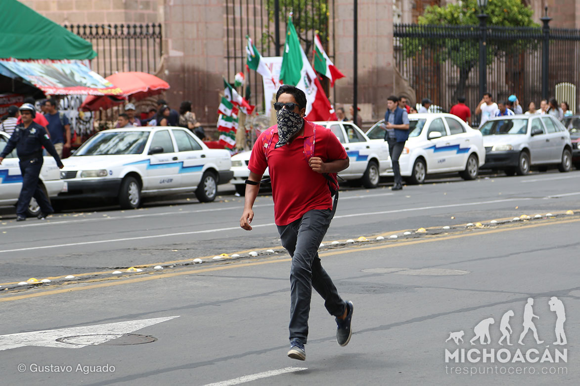 Morelia, Michoacán.-Estudiantes normalistas de la Escuela Normal Superior realizaron una marcha de Casa de Gobierno al Palacio de Gobierno en el Centro Histórico, en protesta para exigir la salida del director de la institución, Fernando Vázquez García.