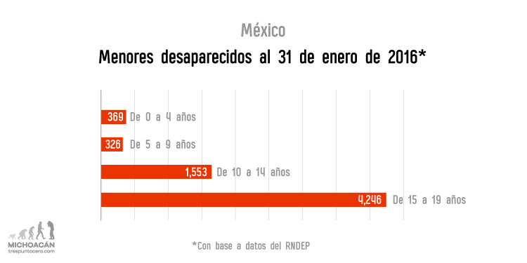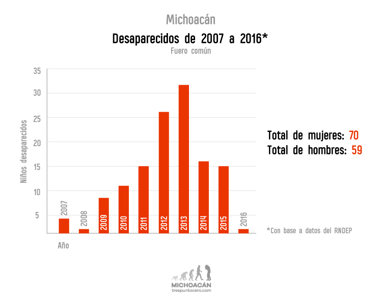 Partiendo de la base de nombres y la relación de edades del Registro en los casos del fuero común, del 2007 a 2016, son 129 los menores de cero a 17 años los desaparecidos, de los que 70 corresponden a mujeres y 59 a hombres.