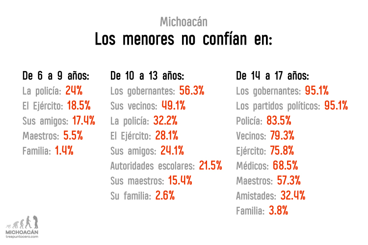 Los menores michoacanos de entre diez y trece años no confían en los gobernantes, con un 56.3 por ciento; el 49.1 por ciento no lo hace en sus vecinos; el 32.2 por ciento en la policía; el 28.1 por ciento en la policía; el 24.1 por ciento en sus amigos; el 21.5 por ciento en las autoridades de su escuela; el 16.4 por ciento en sus maestros; y el 2.6 por ciento en sus familias.