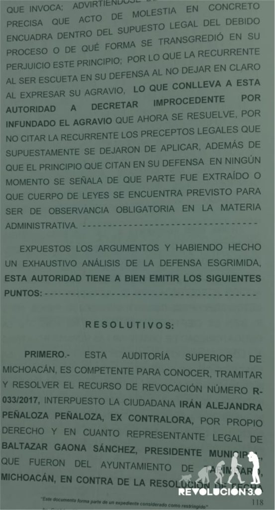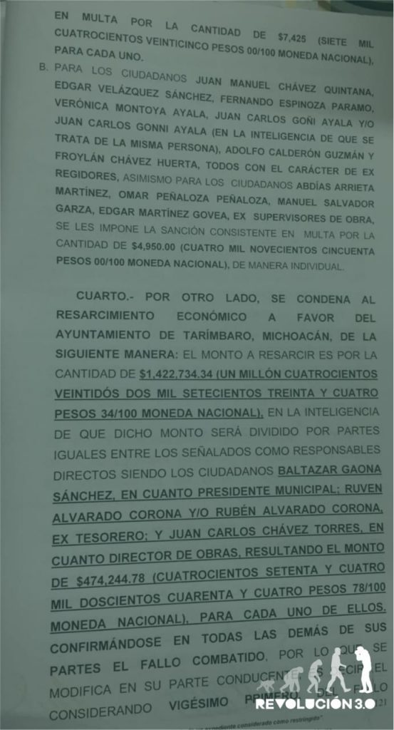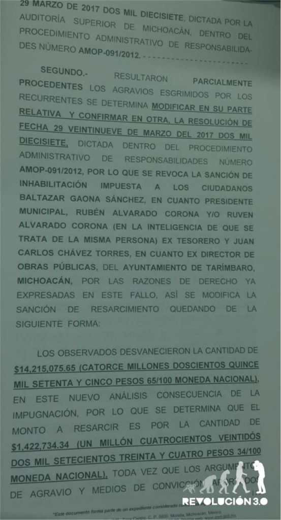 “Resultaron parcialmente procedentes los agravios esgrimidos por los recurrentes, se determina modificar en su parte relativa y confirmar la otra, la resolución de fecha 29 de marzo de 2017, dictada dentro del proceso administrativo de responsabilidades número AMOP-091/201, por lo que se revoca la sanción de inhabilitación impuesta a los ciudadanos Baltazar Gaona Sánchez, en cuanto presidente municipal, Rubén Alvarado Corona extesorero, y Juan Carlos Chávez Torres, en cuanto exdirector de obras públicas del ayuntamiento de Tarímbaro”.