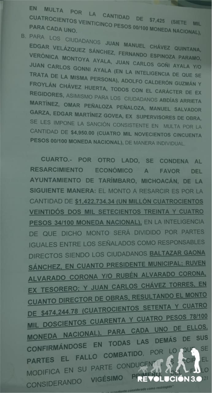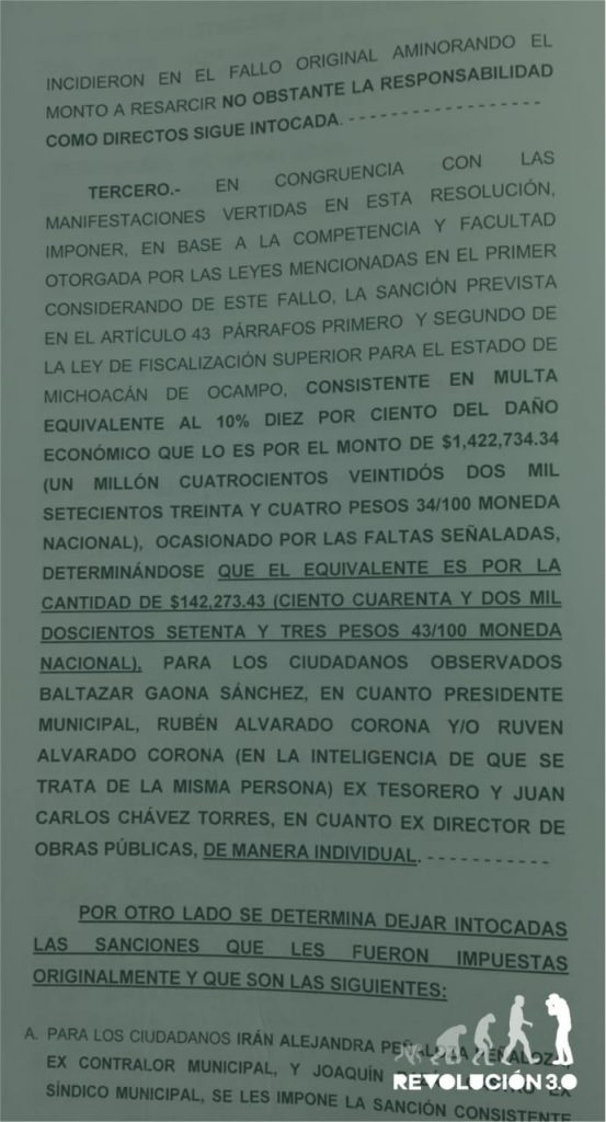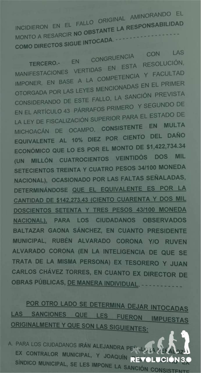 Entonces, en los puntos resolutivos del caso enfocado a la fiscalización de la cuenta pública municipal 2008, de entrada se establece una inhabilitación por el periodo de tres años para el ejercicio de cargos o comisiones en el servicio público, y un monto a resarcir por un millón 533 mil 736.90 pesos a dividir entre Gaona Sánchez, Rubén Alvarado que era el tesorero, y Juan Carlos Chávez que era el director de obras.