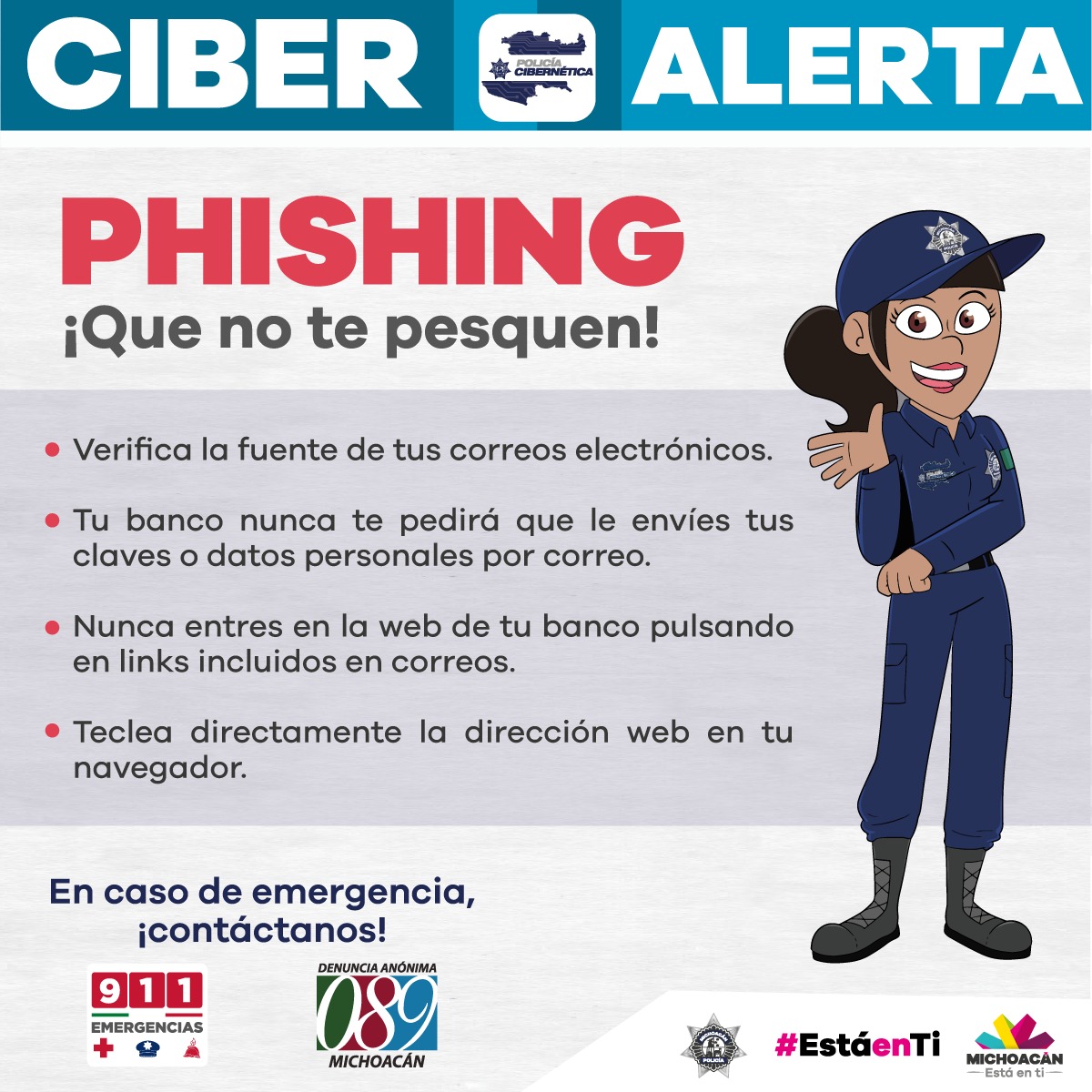 Morelia, Michoacán. – La Policía Cibernética de Michoacán emitió una alerta para los usuarios de la internet sobre el “Phishing”, término empleado para denominar un abuso informático, con el objetivo de cometer una acción fraudulenta mediante un correo electrónico.