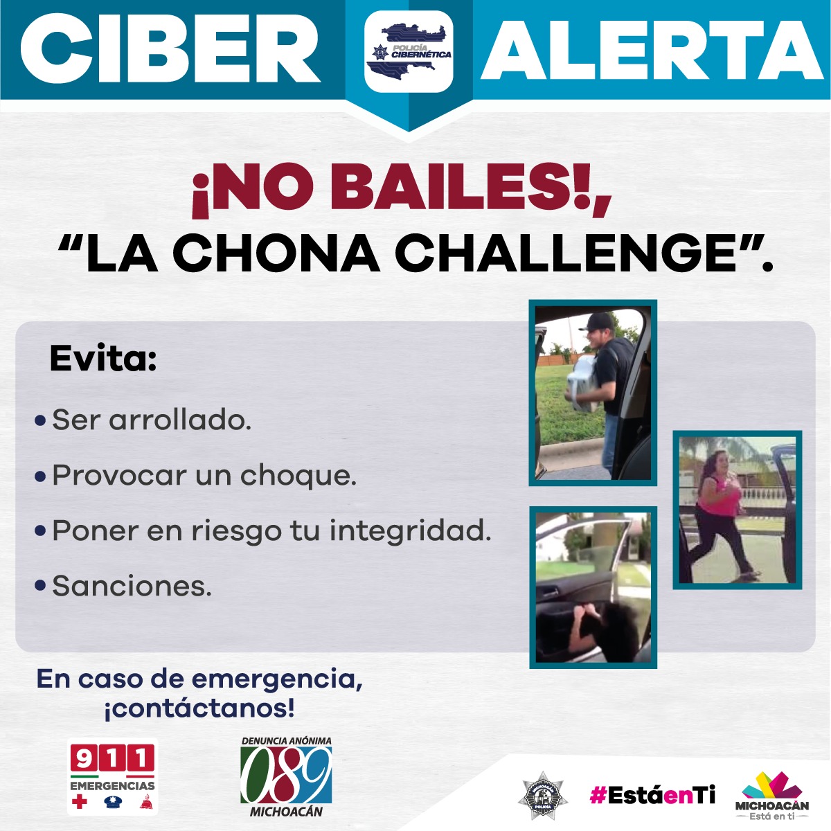 En Michoacán, la Policía Cibernética pidió a los usuarios evitar bailar “La Chona Challenge” para evitar ser arrollado, provocar un accidente, poner en riesgo la integridad personal y evitar sanciones.