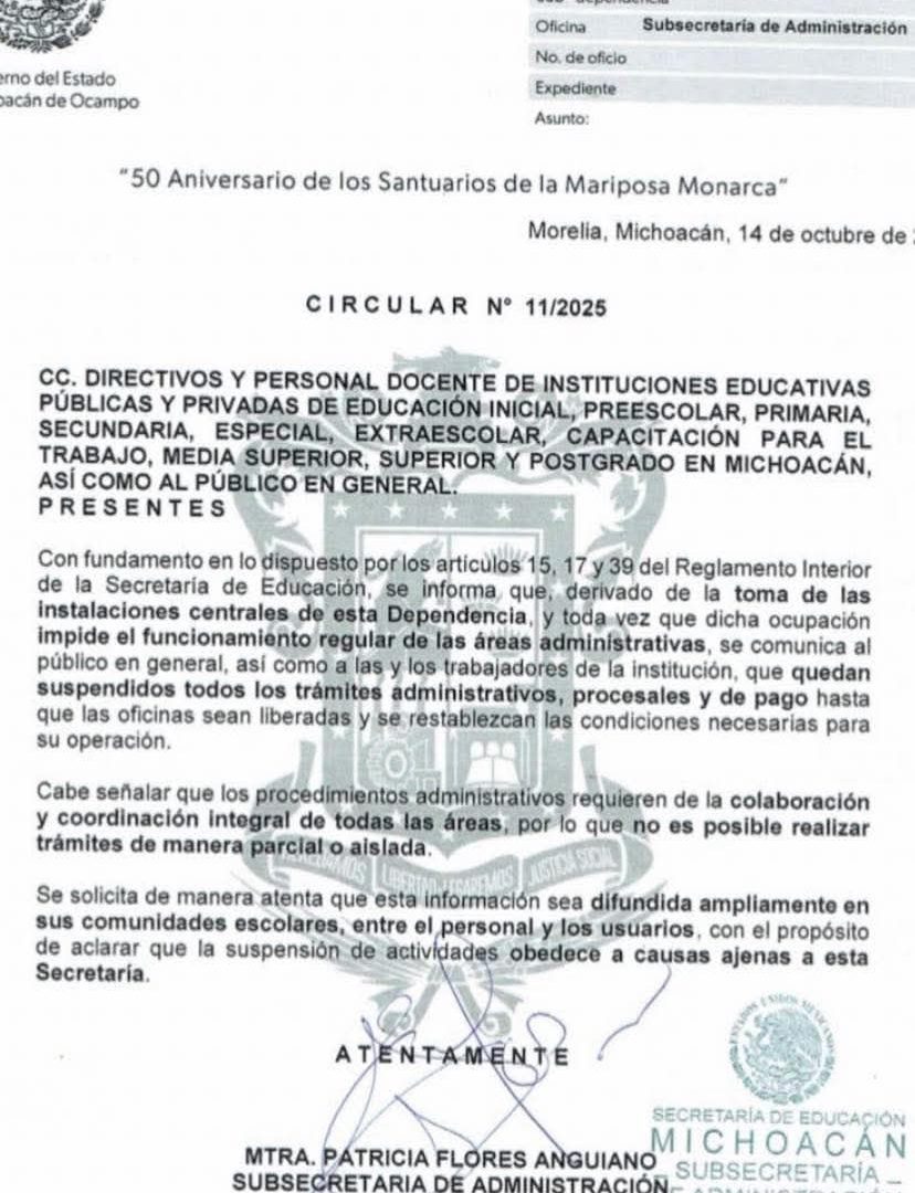 “Derivado de la toma de las instalaciones centrales de esta Dependencia, y toda vez que dicha ocupación impide el funcionamiento regular de las áreas administrativas, se comunica al público en general, así como a las y los trabajadores de la institución, que quedan suspendidos todos los trámites administrativos, procesales y de pago hasta que las oficinas sean liberadas y se restablezcan las condiciones necesarias para su operación”, refiere el aviso firmado por la subsecretaria de Administración, Patricia Flores Anguiano.