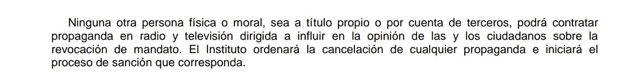 Es decir, las prohibiciones que hace la ley para la promoción de la revocación de mandato están limitadas a Radio y Televisión, por lo que está permitida la propaganda en espectaculares y cualquier otro medio que no sea ni radio ni televisión.