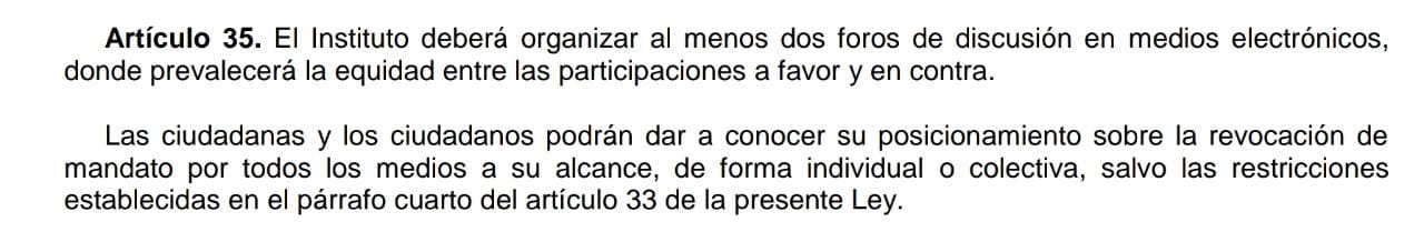 La ley de Revocación de Mandato en sus artículos 33 y 35 establece que la sociedad civil puede promover por los medios que estén a su alcance este ejercicio de democracia participativa