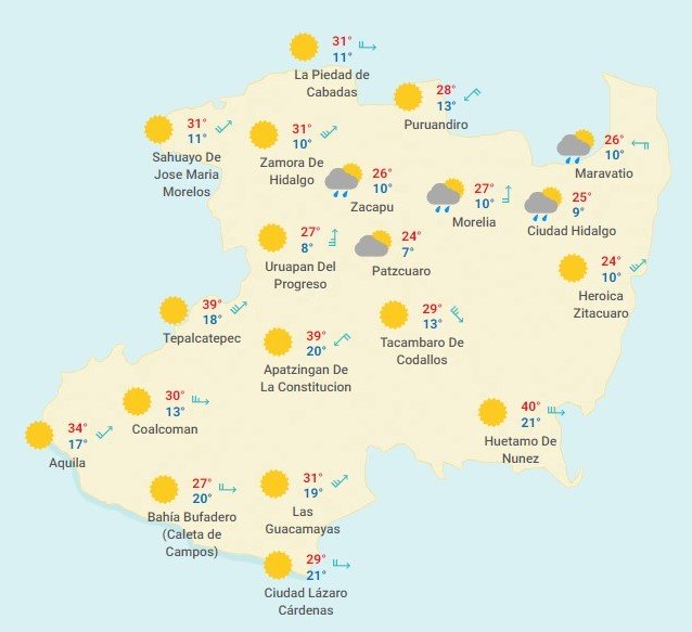 Hoy en Morelia el tiempo será de10ºC de temperatura mínima y 27ºC de máxima con un 19% de nubes y una probabilidad de lluvia del 30%.