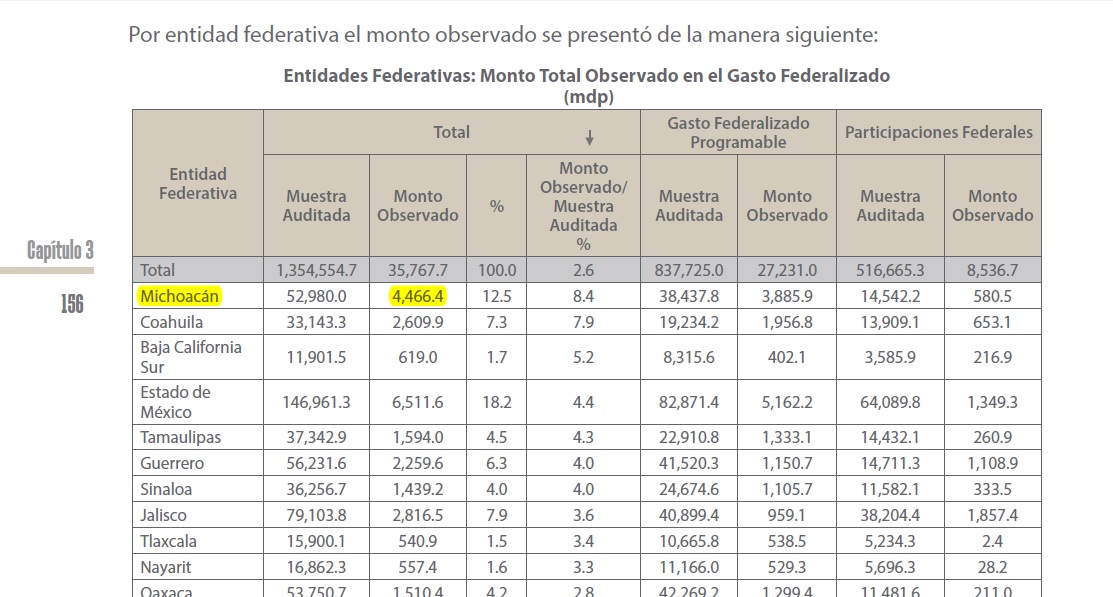 Este miércoles la Auditoría Superior de la Federación (ASF) presentó su informe sobre la revisión de la Cuenta Pública Federal correspondiente al ejercicio fiscal 2017, en donde Michoacán se ubica como la entidad con mayor monto de recursos observados en todo el país, con un monto cuatro mil 466.4 millones de pesos.
