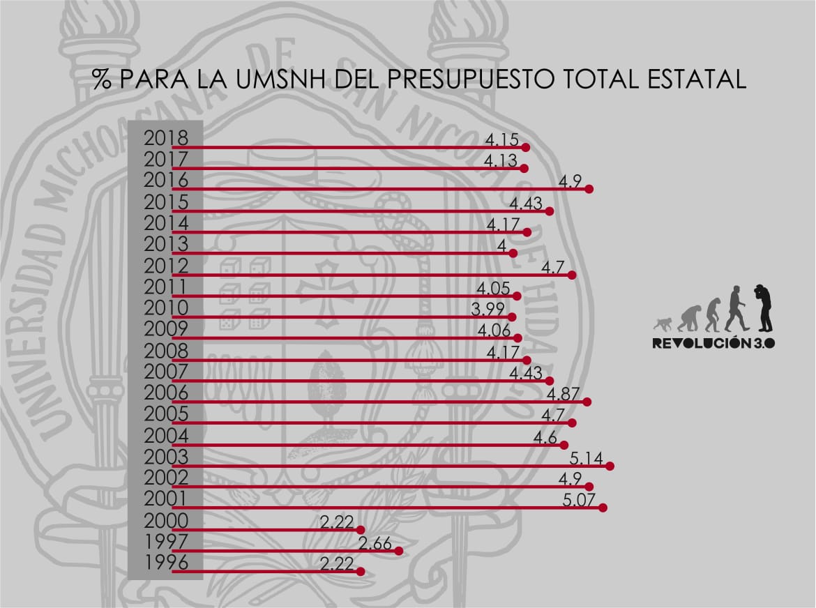 En este siglo a la Universidad se le destina entre en promedio el 4.4 por ciento del presupuesto total del estado. En la década de los 90, era el 2.2 por ciento del total presupuestal lo que iba para la Michoacana.