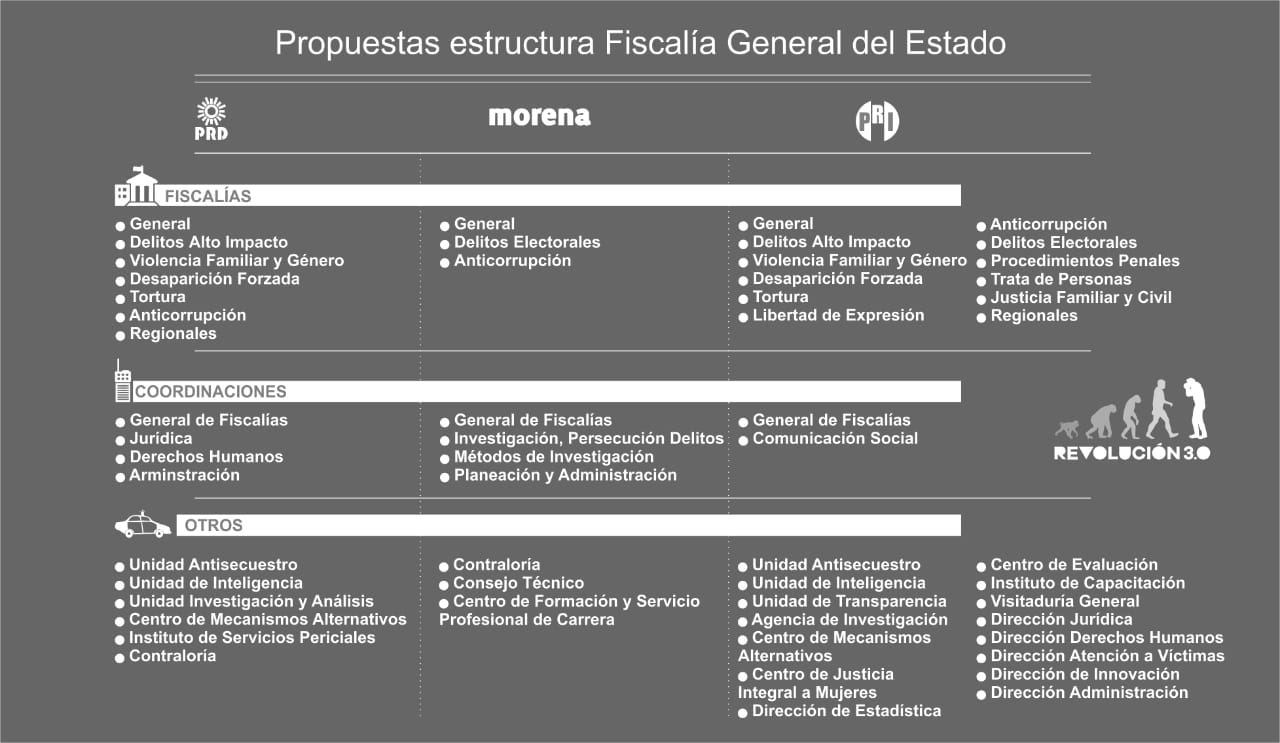Proyecta una estructura básica para la Fiscalía integrada por 28 áreas: las fiscalías General; de Atención Especializada a Delitos de Alto Impacto; para la Atención de Delitos de Violencia Familiar y de Género; para la investigación y persecución de los delitos de Desaparición Forzada de Personas y la cometida por particulares; la Especializada en la investigación del delito de tortura; la Especializada en la Investigación de Delitos cometidos contra la Libertad de Expresión; la Especializada en Combate a la Corrupción; la Especializada para la Atención de Delitos Electorales; la de Procedimientos Penales; la Especializada en Atención de Trata de Personas; la Especializada en Justicia Familiar y Civil; y las regionales con su coordinación general.