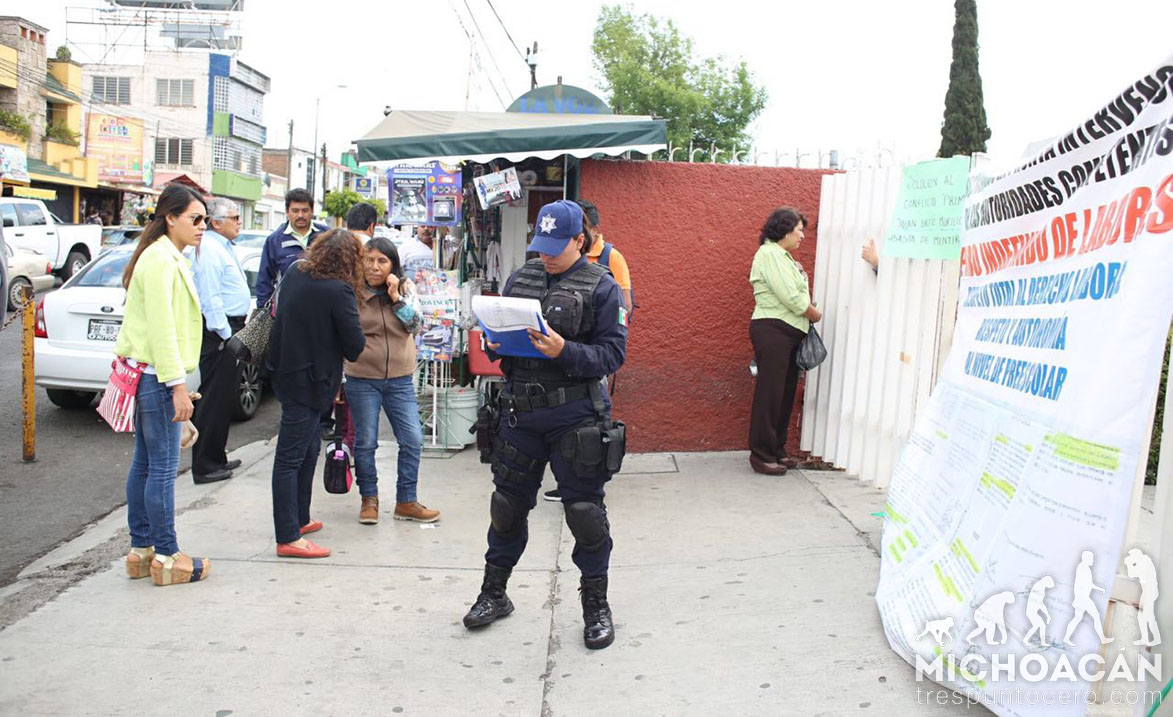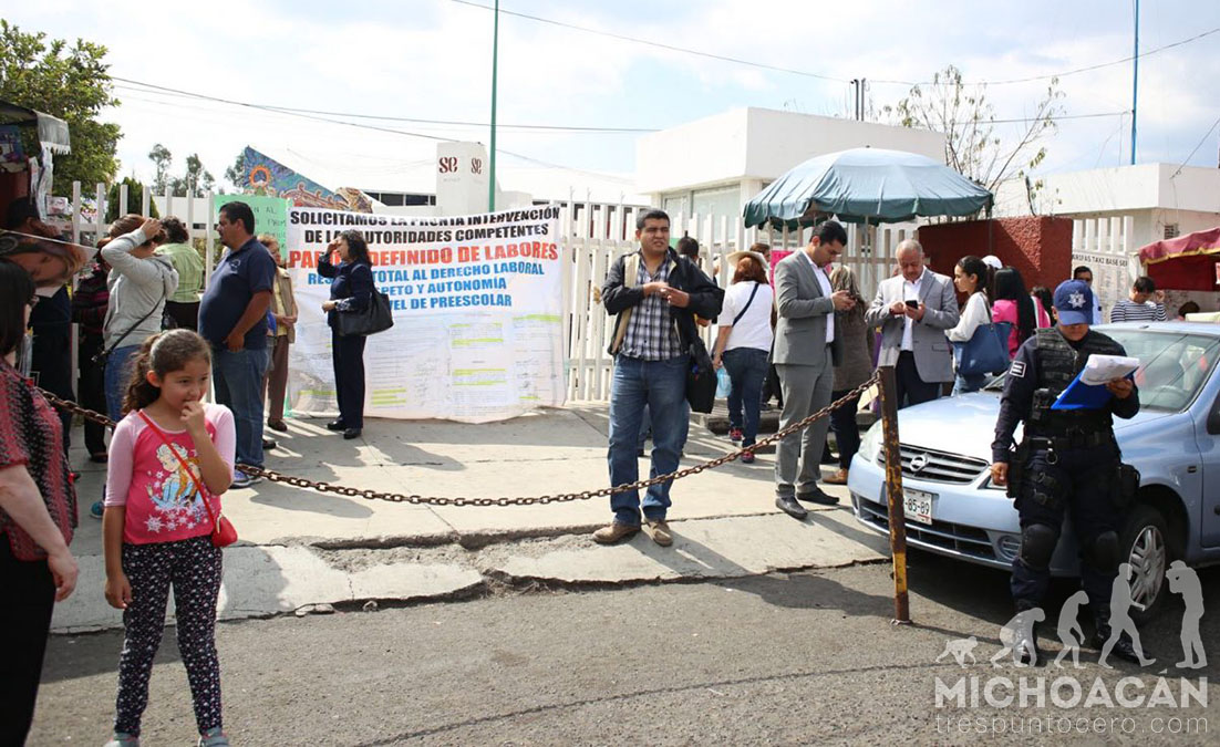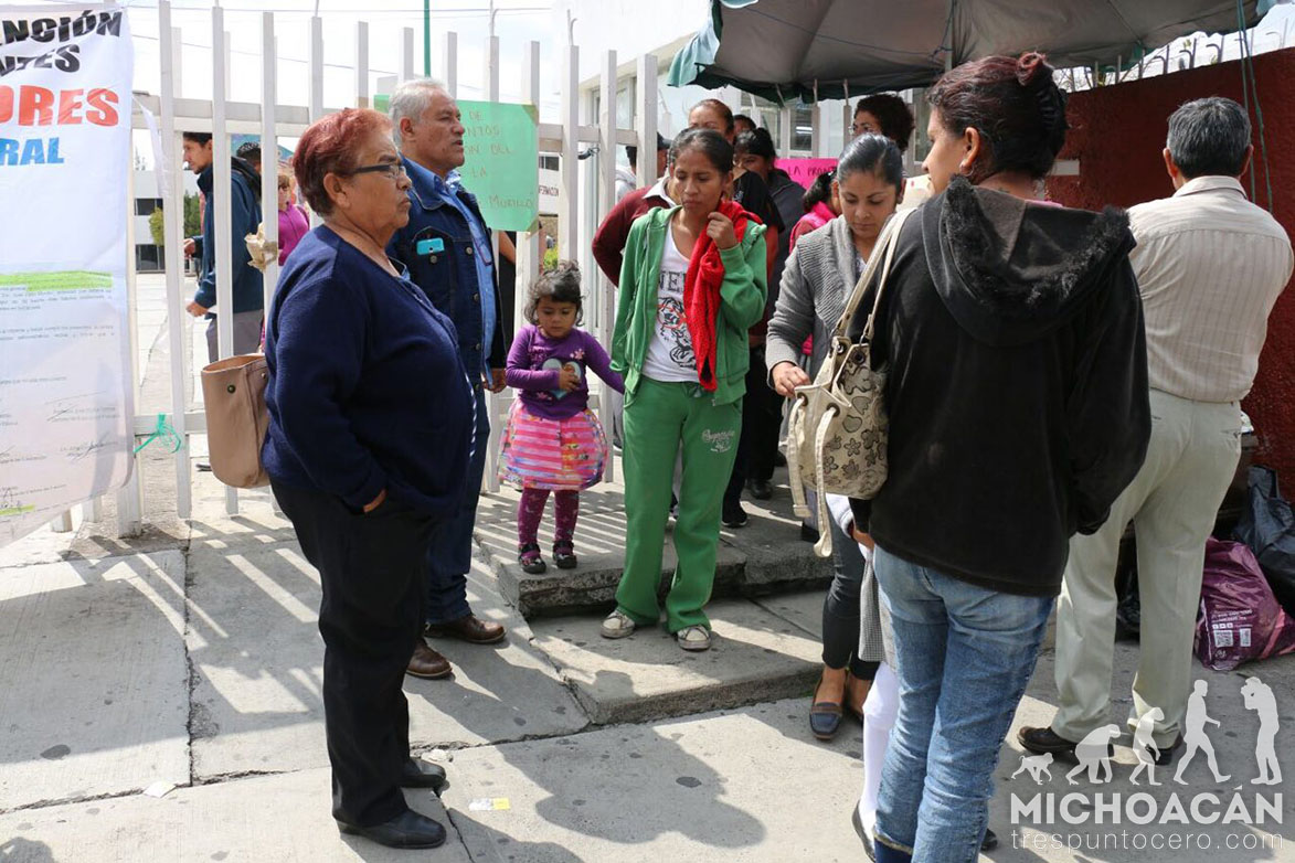 Morelia, Michoacán.-Padres de familia y profesores de la Escuela Primaria Juan Ortiz Murillo mantienen una protesta frente a la Secretaría de Educación del Estado (SEE) para exigir solución a la problemática suscitada desde el año pasado debido al programa de Tiempo Completo.