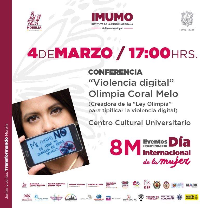 Morelia, Michoacán.- El próximo lunes 4 de marzo, el Instituto de la Mujer Moreliana realizará una conferencia titulada “Violencia digital” a cargo de Olimpia Coral Melo.