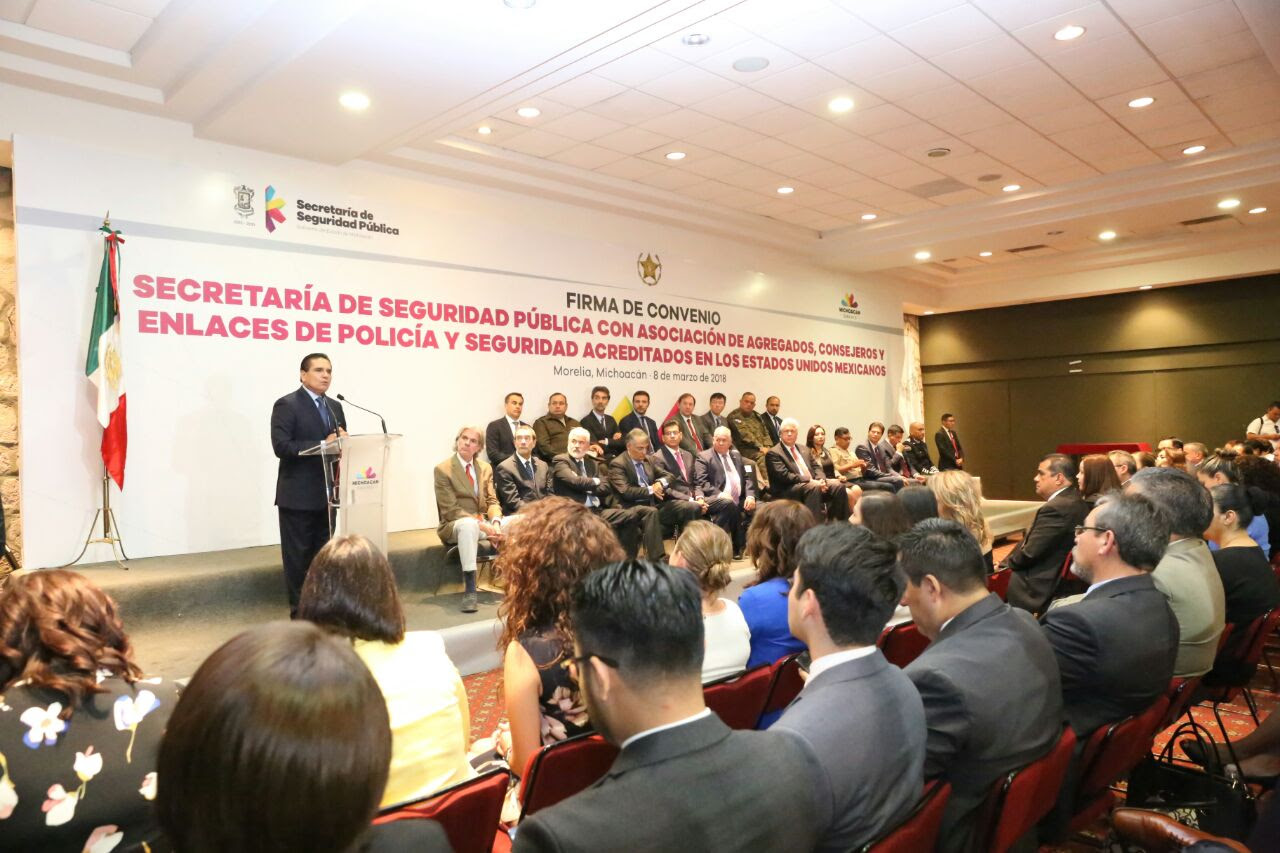 Morelia, Michoacán. Hoy Michoacán da un paso significativo para profesionalizar, capacitar y fortalecer a sus policías, al ser la primera entidad en signar un convenio entre la Secretaría de Seguridad Pública y la Asociación de Agregados, Consejeros y Enlaces de Policía y Seguridad acreditados en los Estados Unidos Mexicanos, mismo que fue celebrado y aplaudido por el Gobernador Constitucional Silvano Aureoles Conejo.